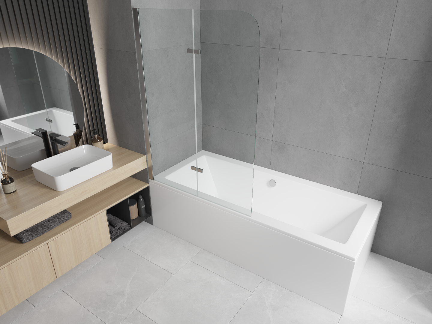 Parawan wykonany z dwóch skrzydeł z możliwością złożenia. Takie rozwiązanie pozwala zaoszczędzić więcej miejsca w łazience i umożliwia swobodne korzystanie z pozostałej przestrzeni, gdy nie korzystamy ze strefy kąpielowej.