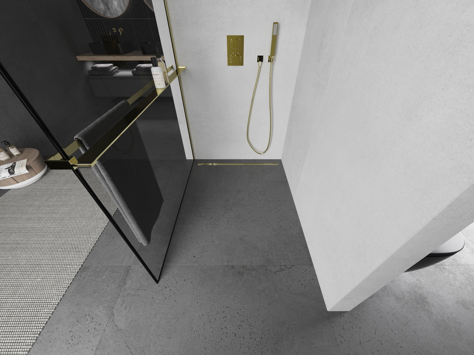 Mexen Kioto+ ścianka prysznicowa z półką Walk-in 70 x 200 cm, czarna ramka, złota - 800-070-121-50-70