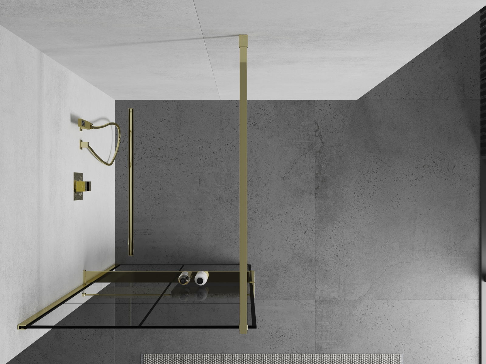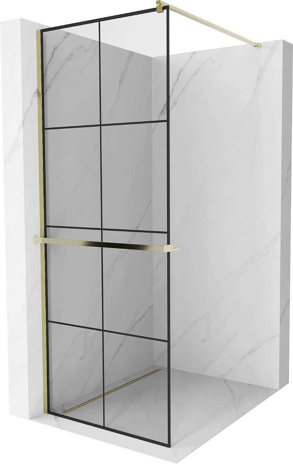 Mexen Kioto+ ścianka prysznicowa z półką Walk-in 90 x 200 cm, czarna kratka, złota - 800-090-121-50-77