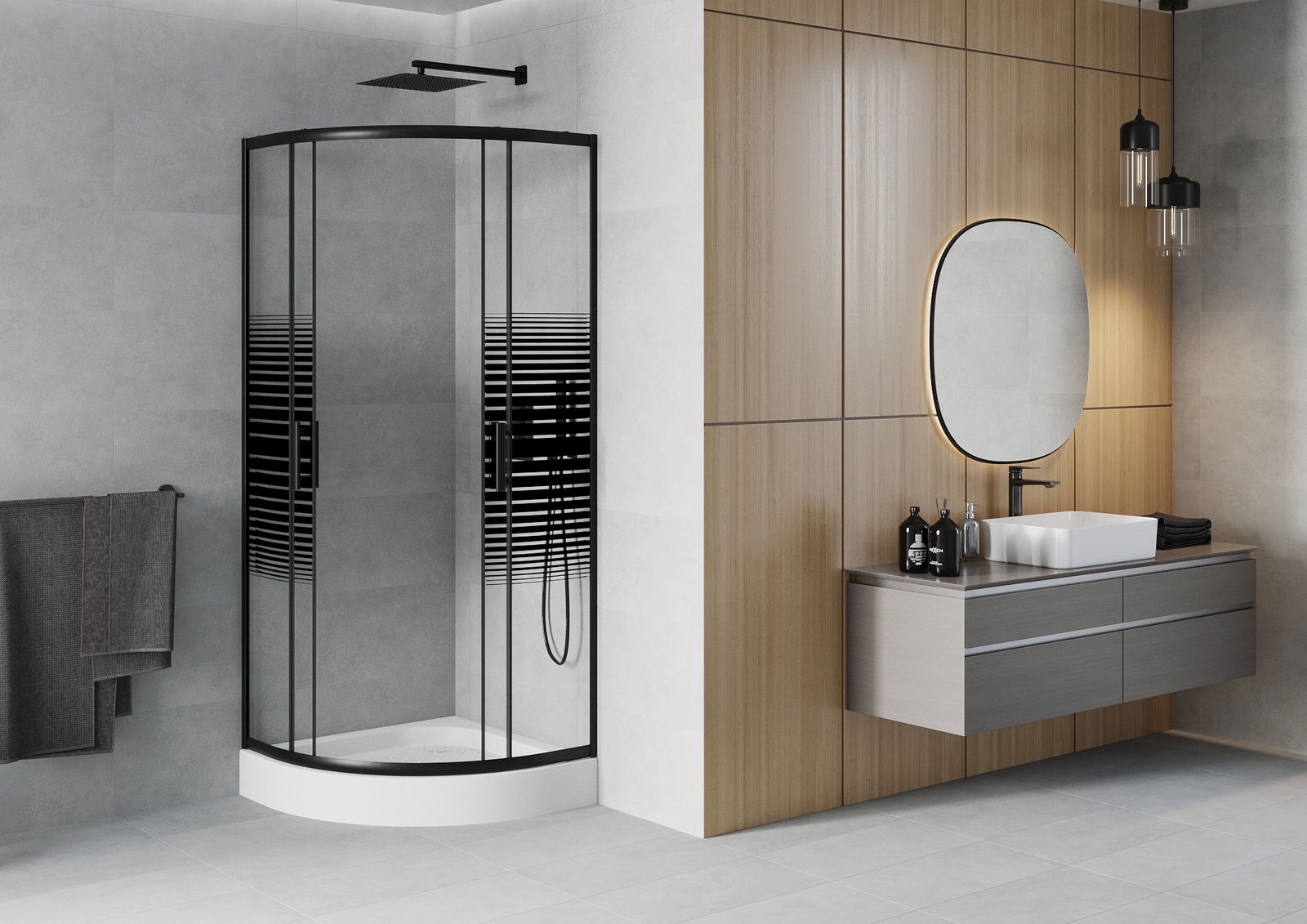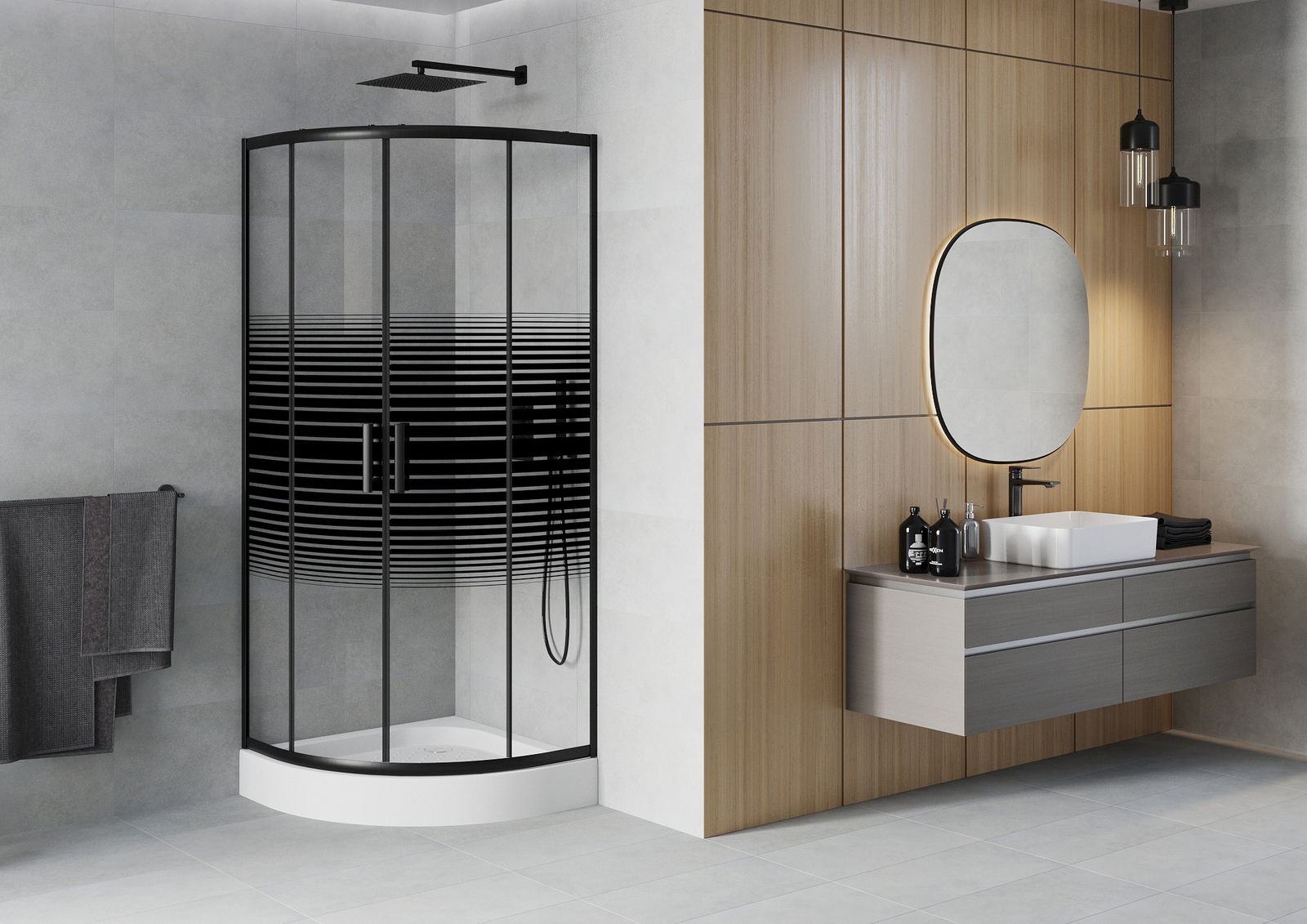 Poręczny i wygodny uchwyt został wykonany z trwałego i odpornego metalu. Modny kształt w połączeniu z wykończeniem dopasowanym do koloru profili nadaje całości nowoczesnego i stylowego wyglądu, podkreślając estetykę każdej łazienki.