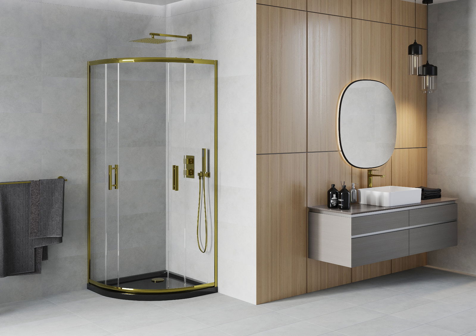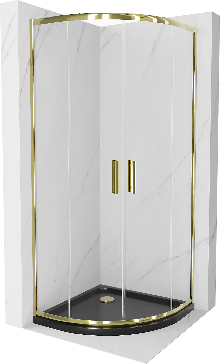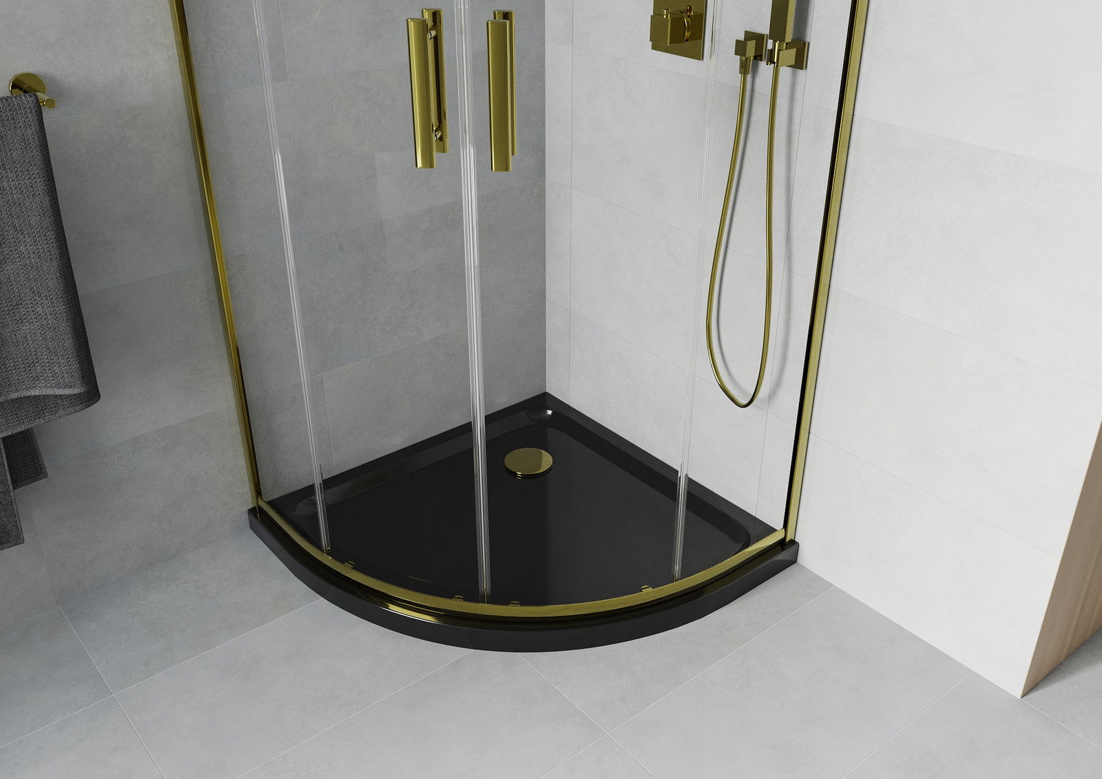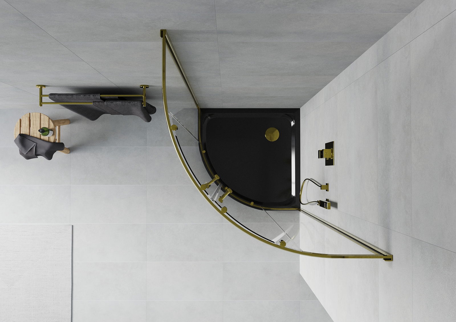 Mexen Rio kabina prysznicowa półokrągła 90 x 90 cm, transparent, złota + brodzik Flat, czarny - 863-090-090-50-00-4170G