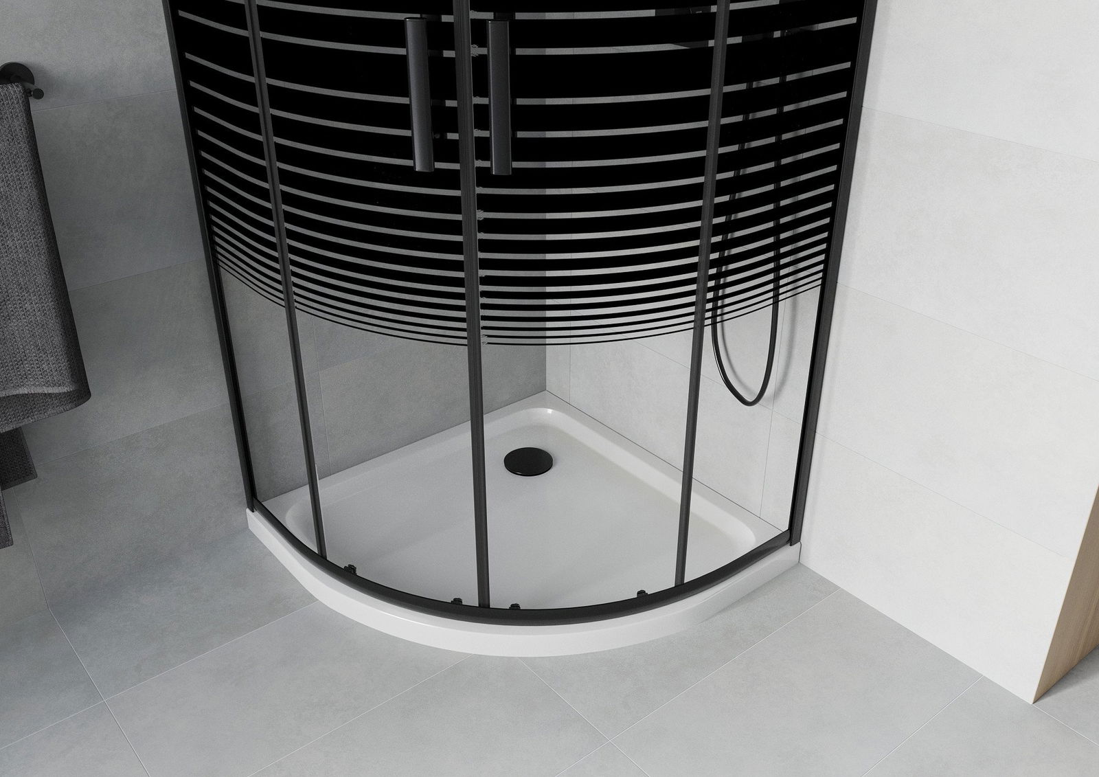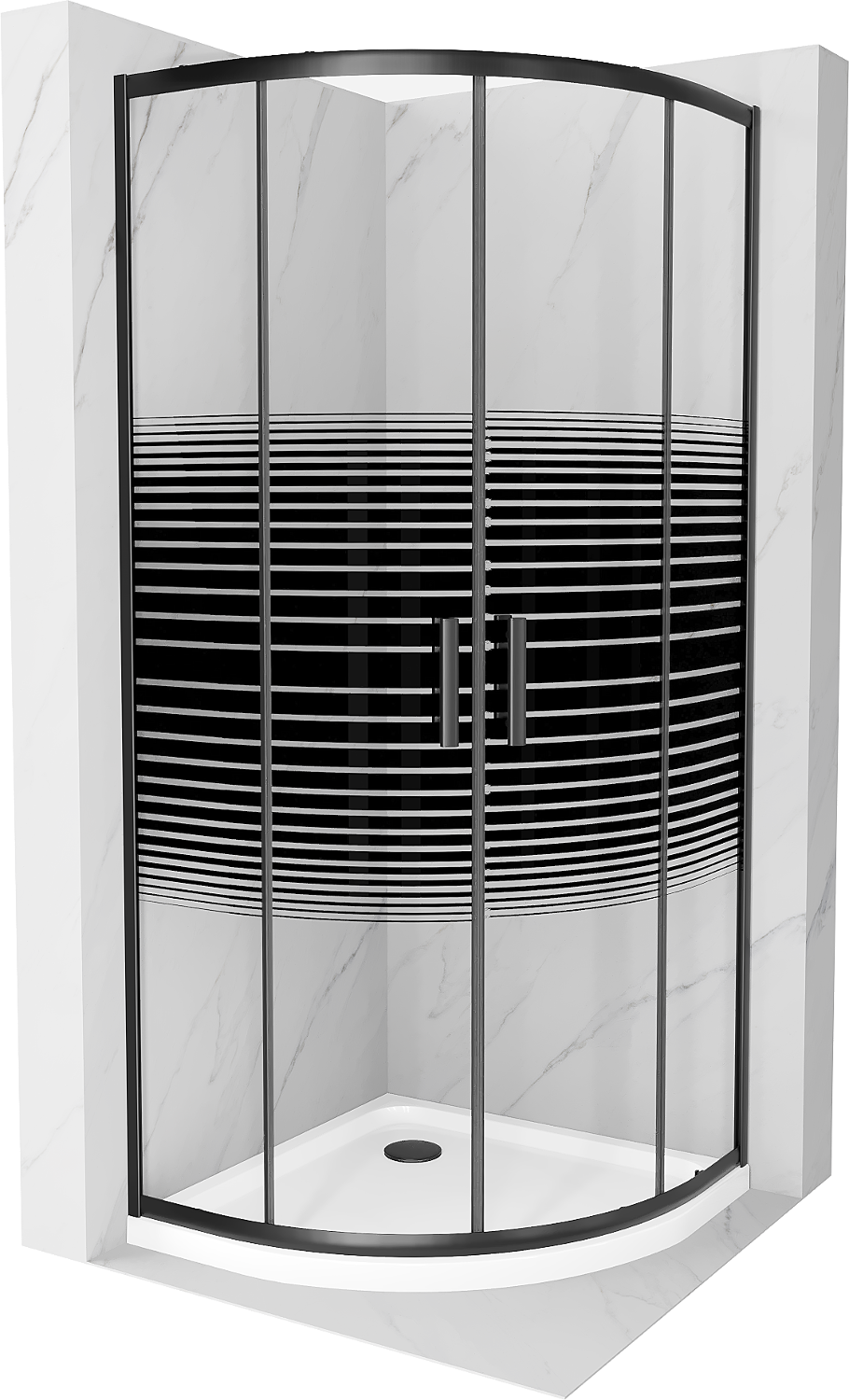 Mexen Rio kabina prysznicowa półokrągła 90 x 90 cm, czarne pasy, czarna + brodzik Flat, biały - 863-090-090-70-20-4110B