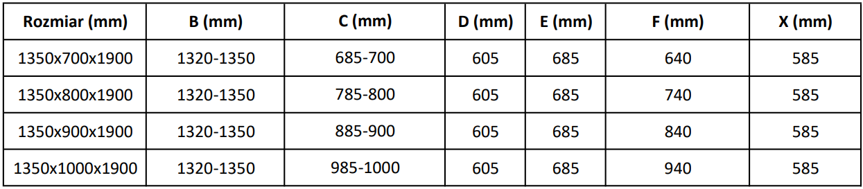 Rozmiar: 135x70 cm (drzwi 135 cm. ścianka 70 cm)