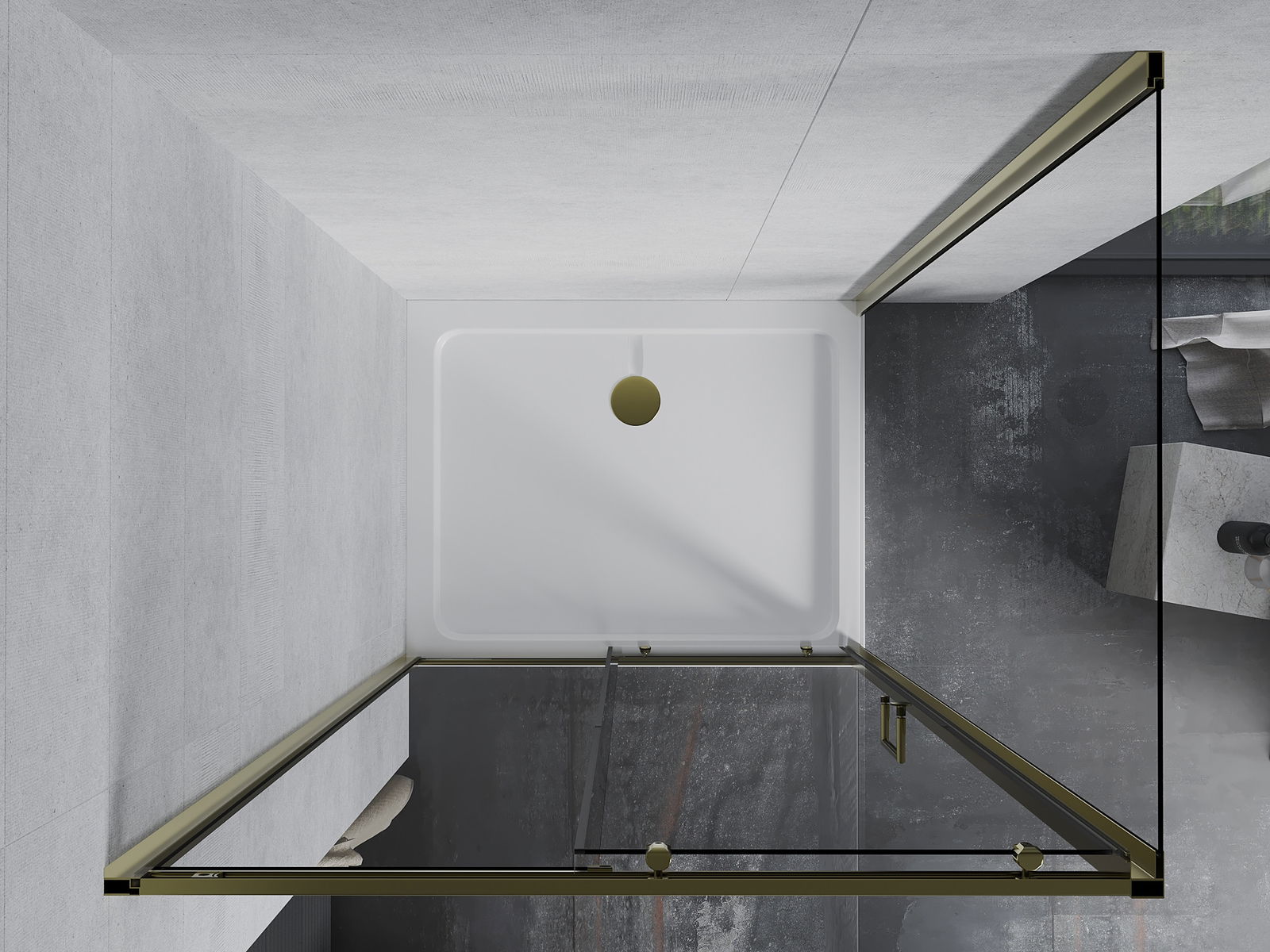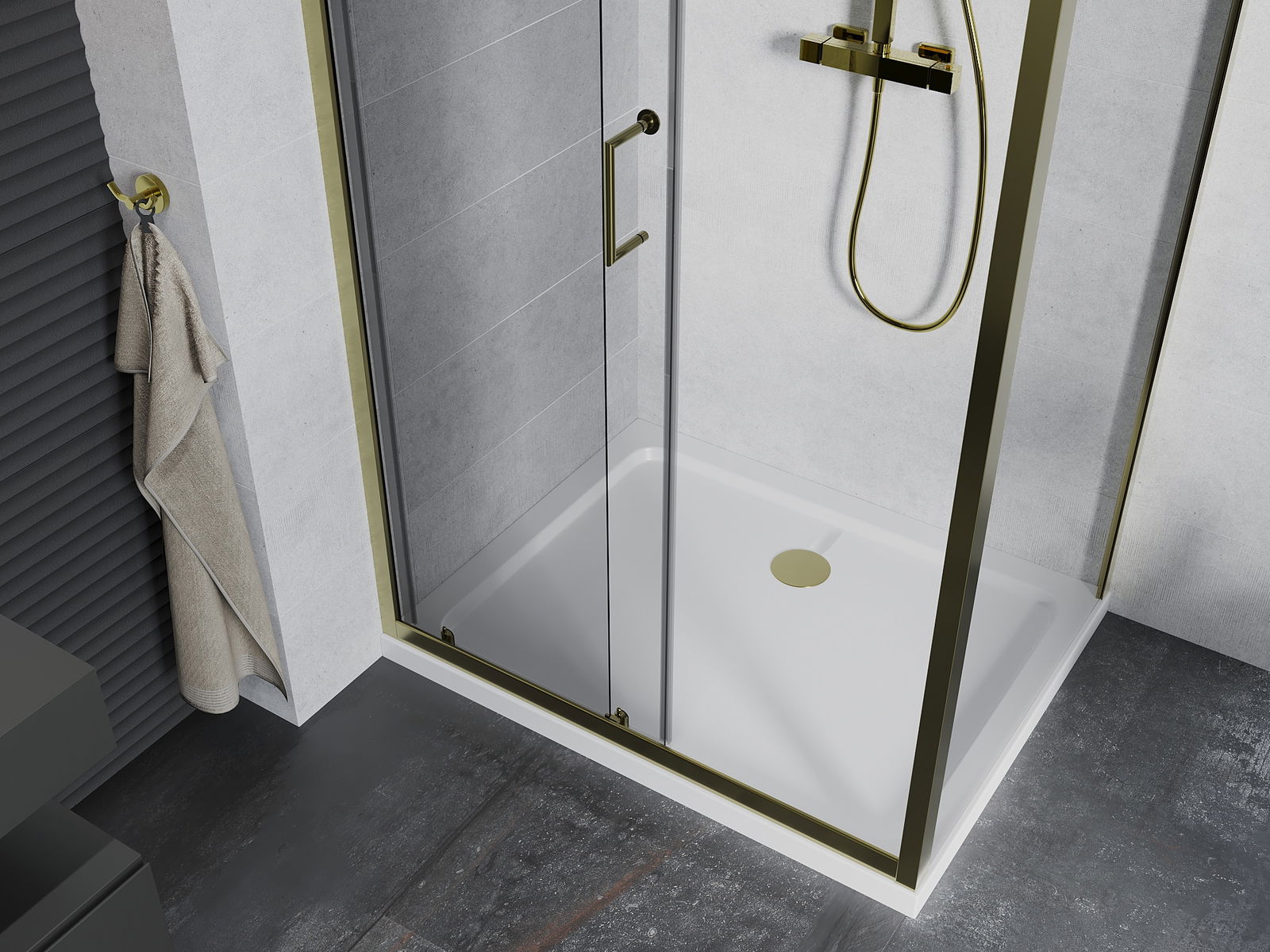 Mexen Apia kabina prysznicowa rozsuwana 90 x 80 cm, transparent, złota + brodzik Flat, biały- 840-090-080-50-00-4010G