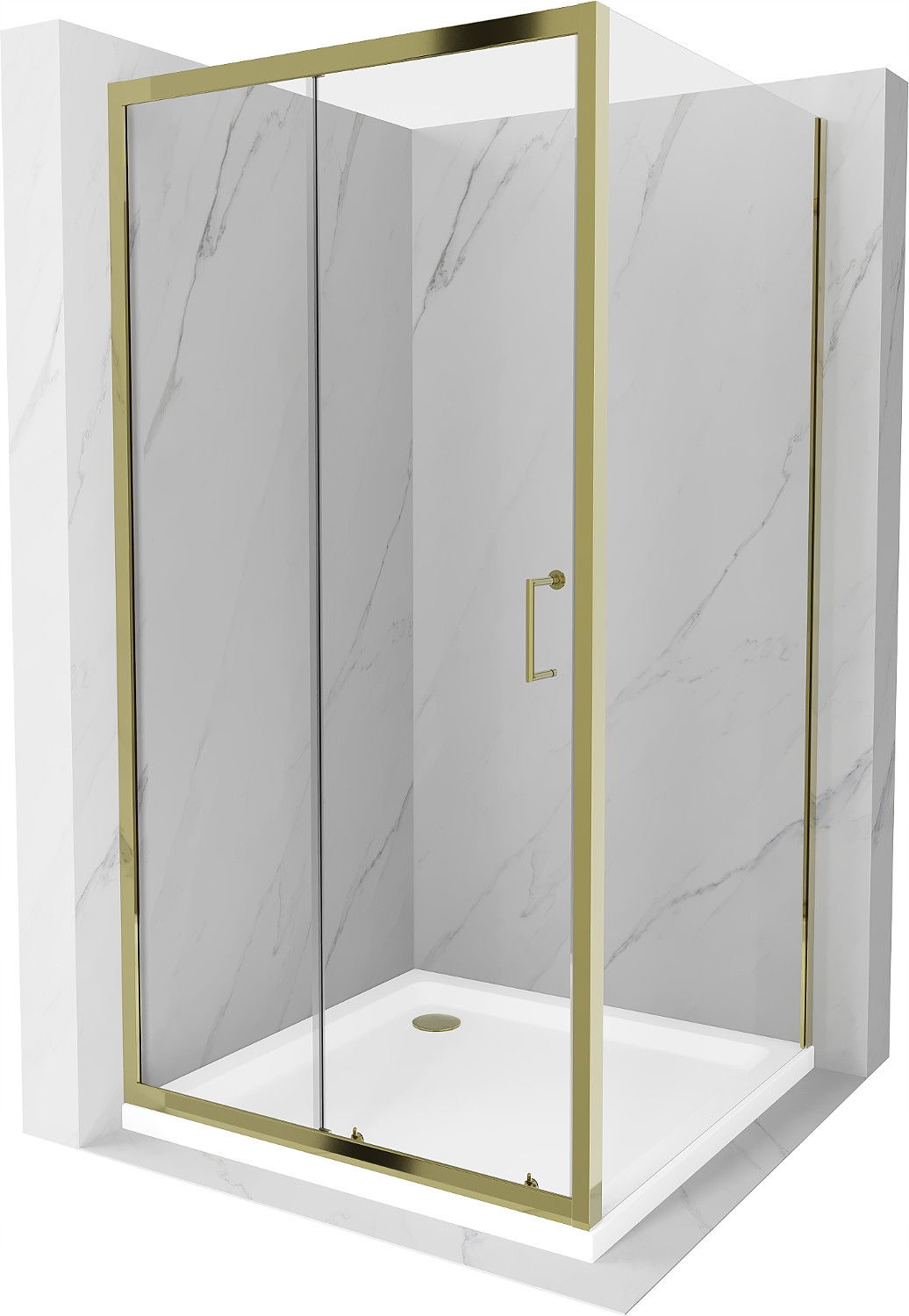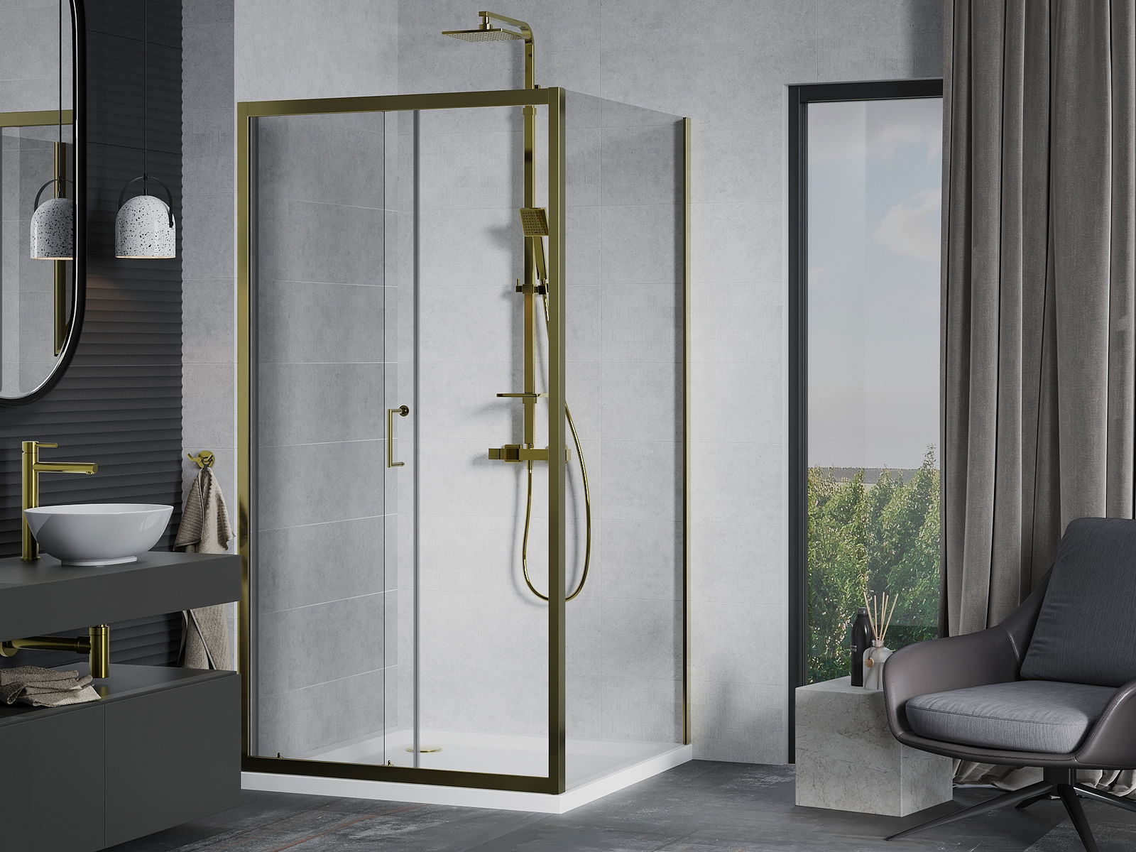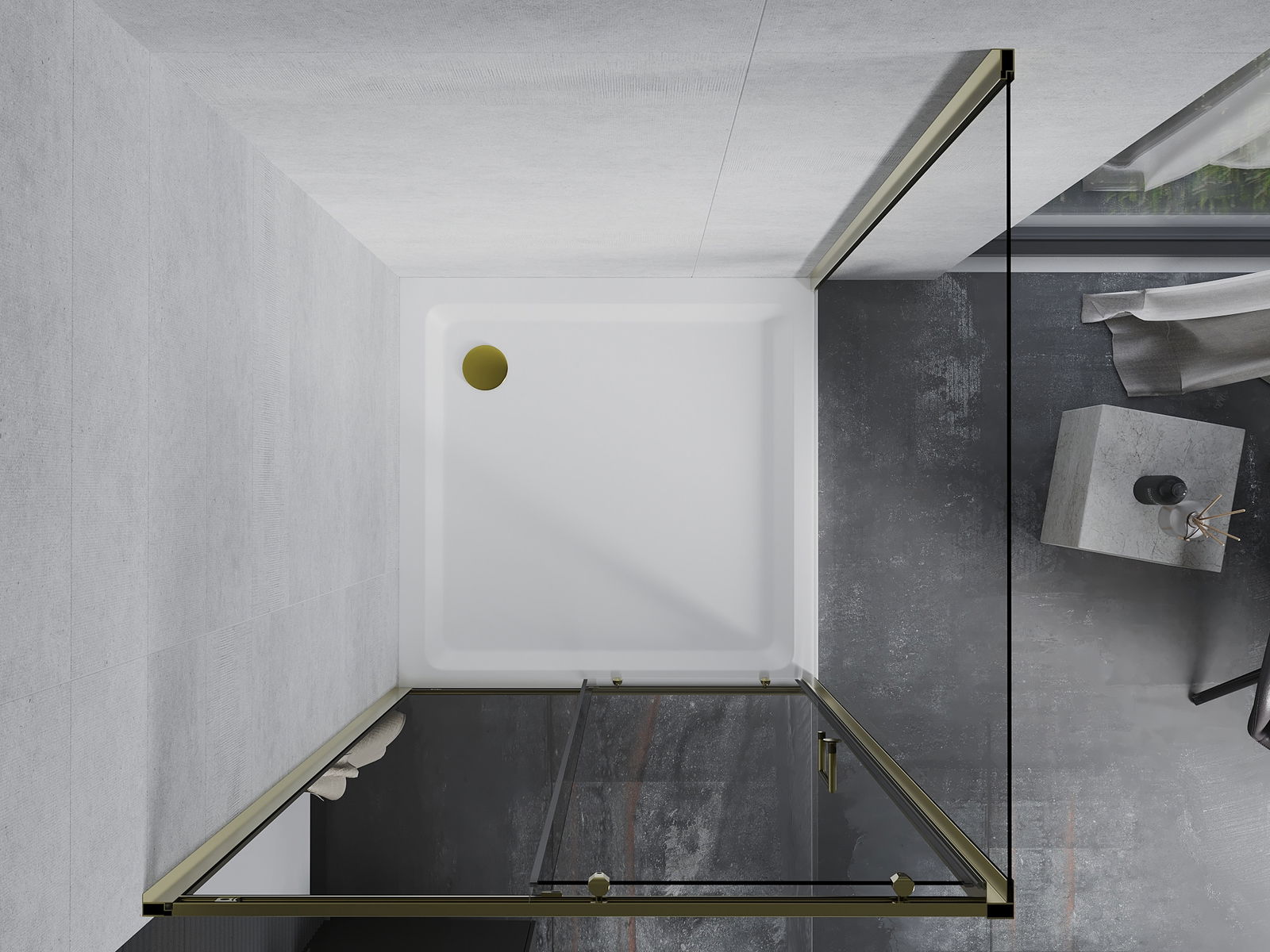 Mexen Apia kabina prysznicowa rozsuwana 90 x 90 cm, transparent, złota + brodzik Flat, biały- 840-090-090-50-00-4010G