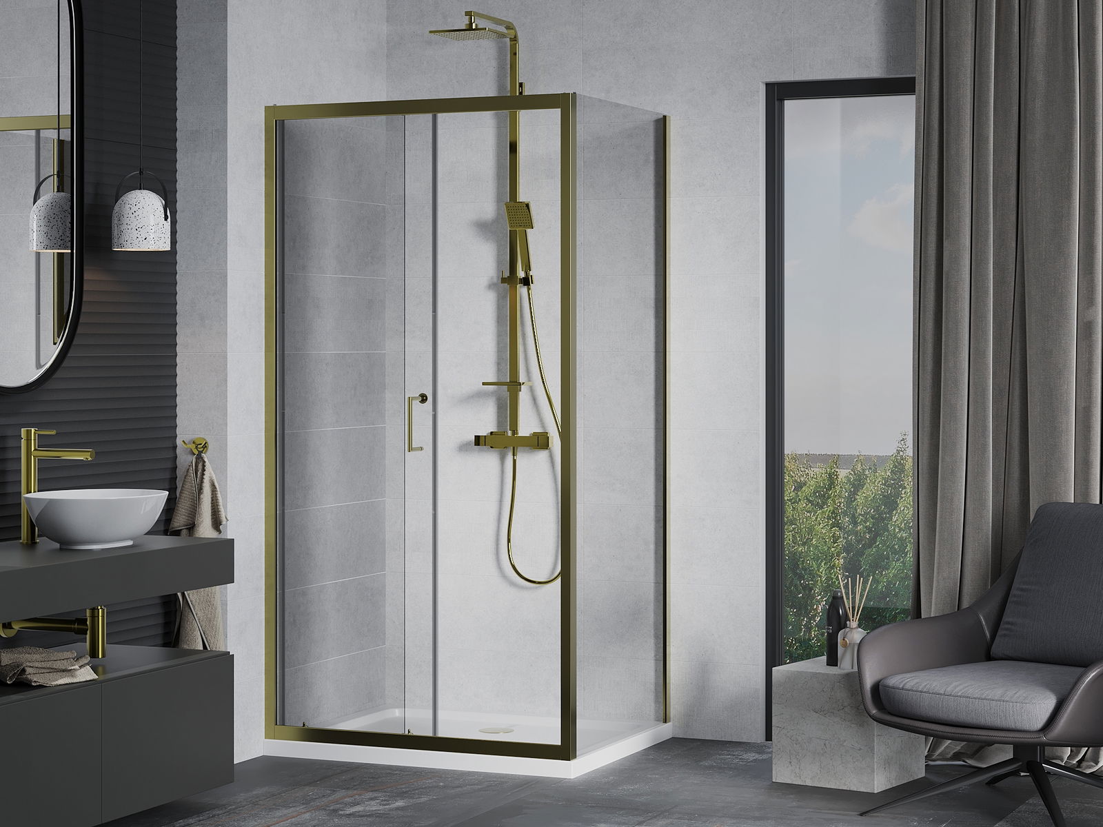 Mexen Apia kabina prysznicowa rozsuwana 100 x 90 cm, transparent, złota + brodzik Flat, biały- 840-100-090-50-00-4010G