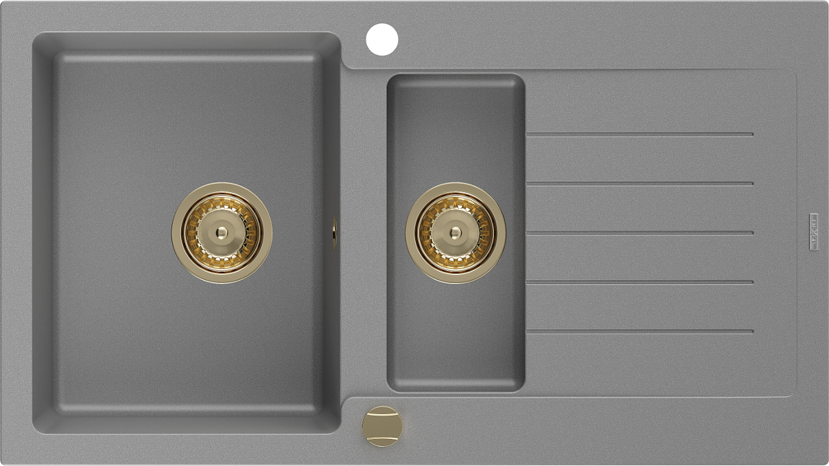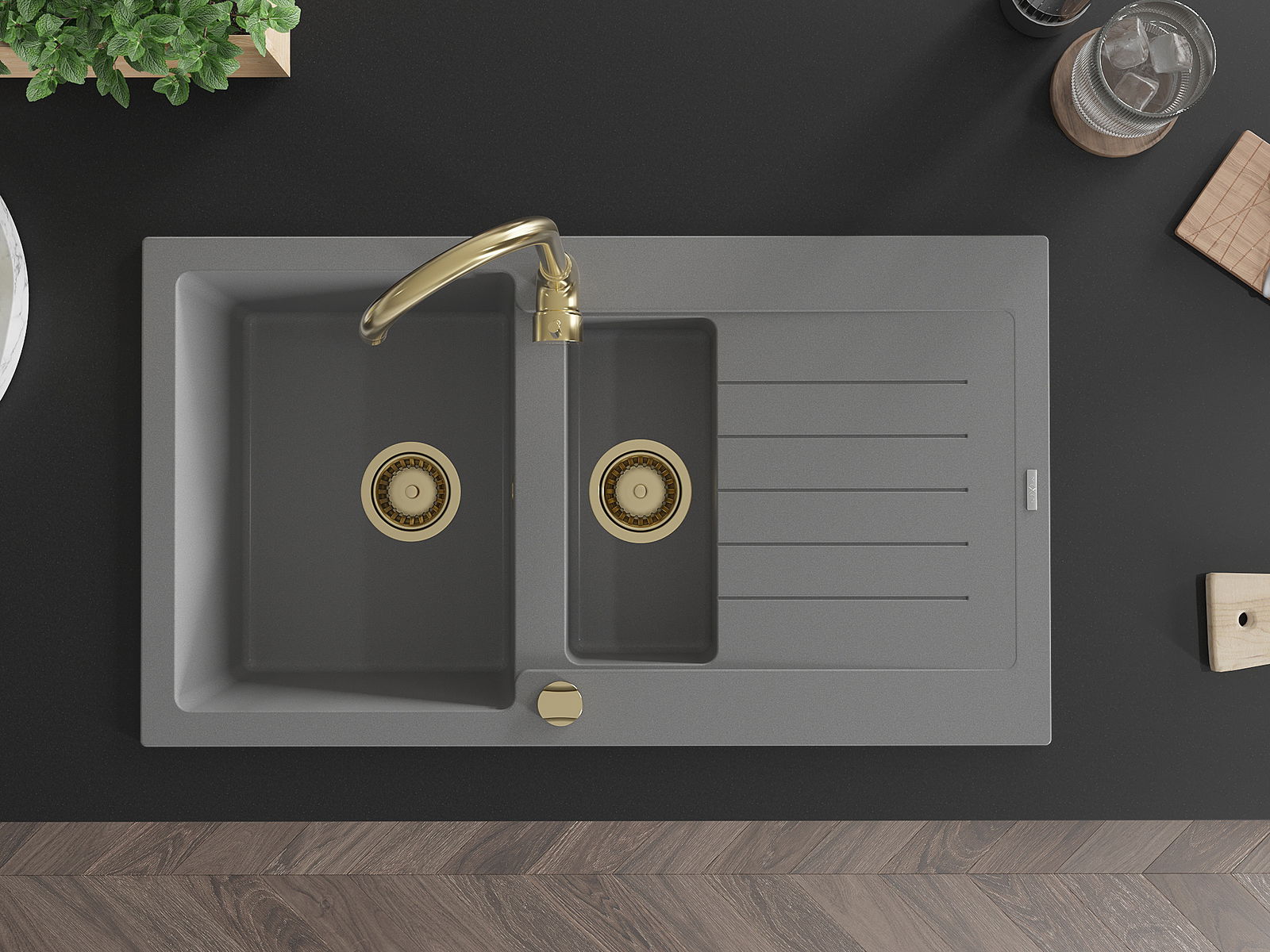 Mexen Matias zlewozmywak granitowy 1,5-komorowy ociekaczem 900 x 505 mm, szary, syfon złoty - 6502901505-71-G