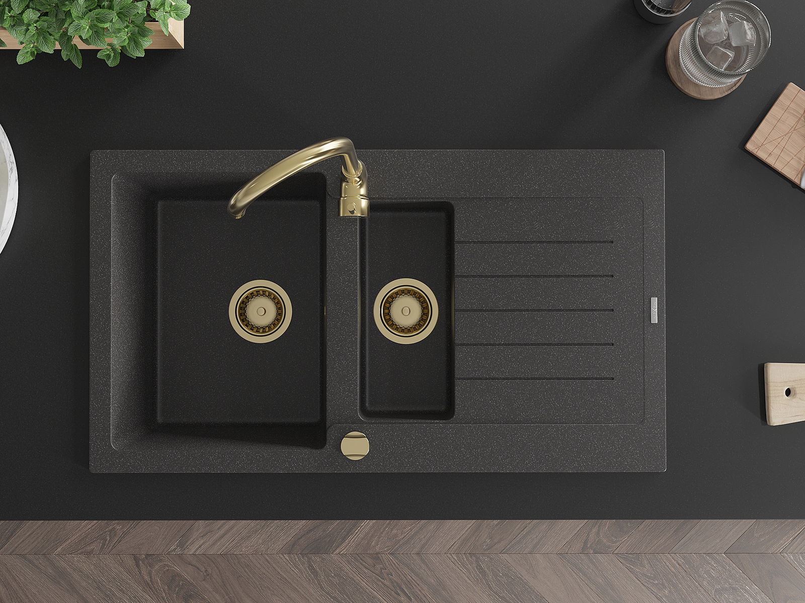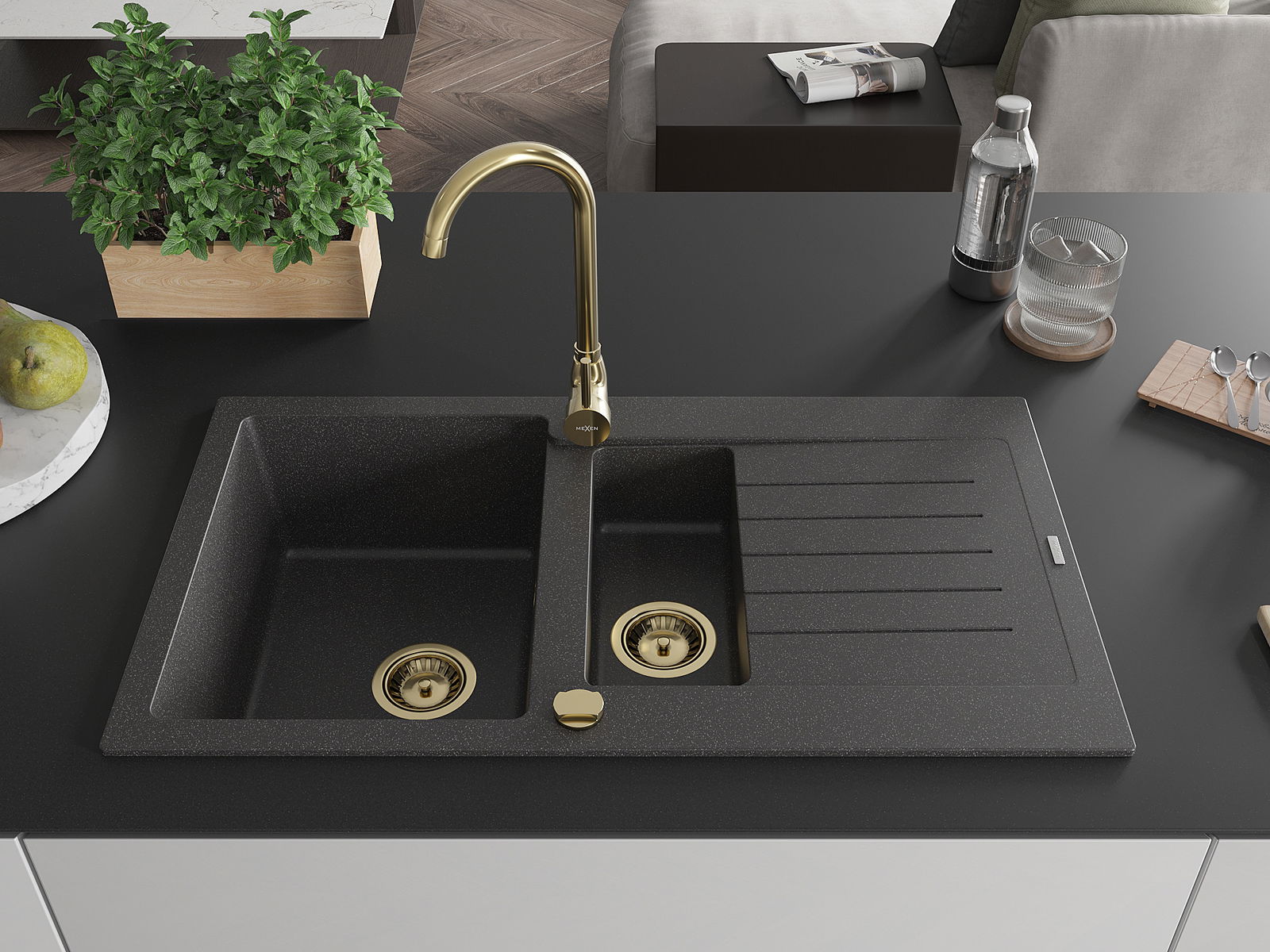 Mexen Matias zlewozmywak granitowy 1,5-komorowy z ociekaczem 900 x 505 mm, czarny nakrapiany, syfon złoty - 6502901505-76-G