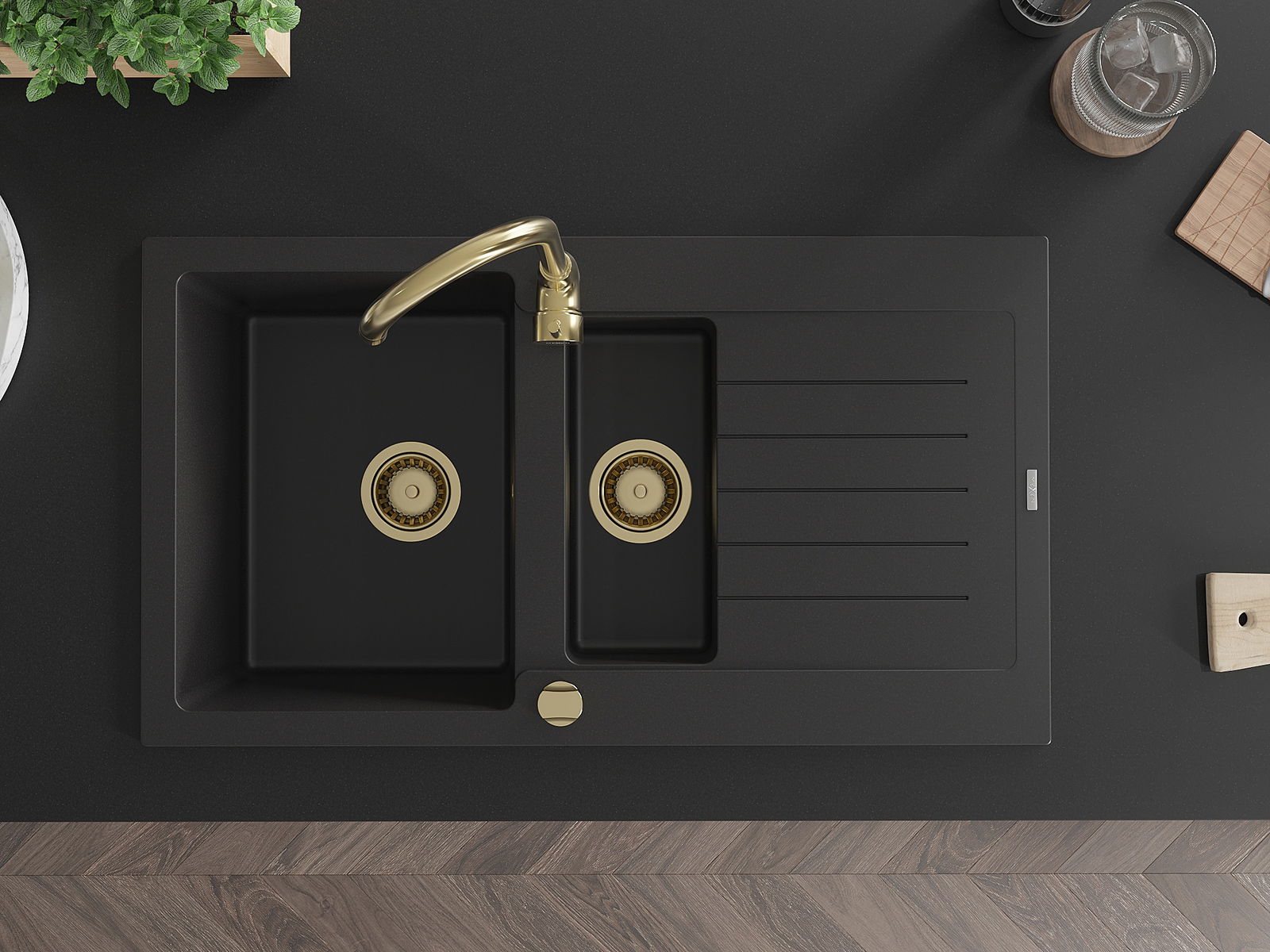 Mexen Matias zlewozmywak granitowy 1,5-komorowy z ociekaczem 900 x 505 mm, czarny, syfon złoty - 6502901505-77-G