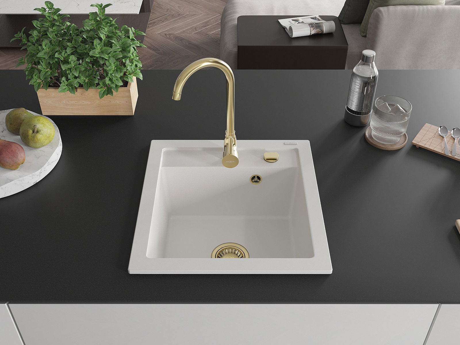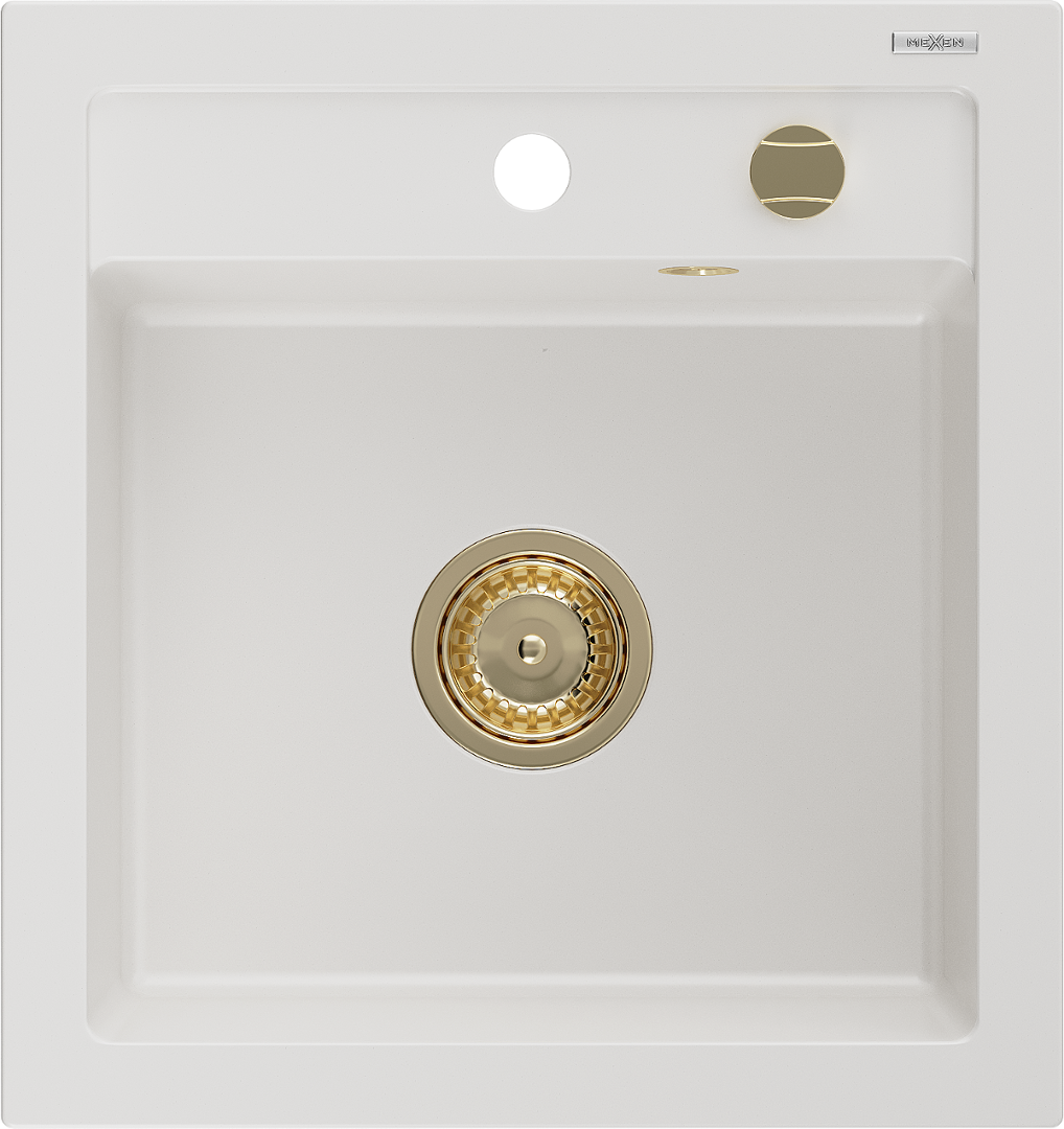 Mexen Vito zlewozmywak granitowy 1-komorowy 520 x 490 mm, biały, syfon złoty - 6503521000-20-G