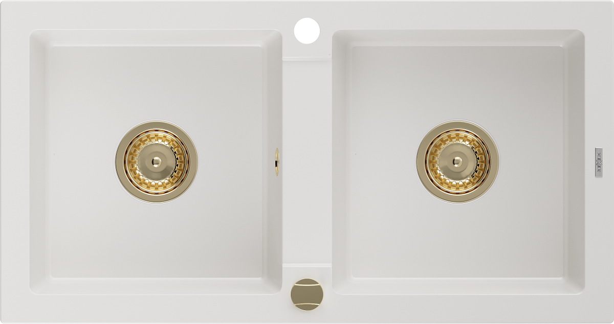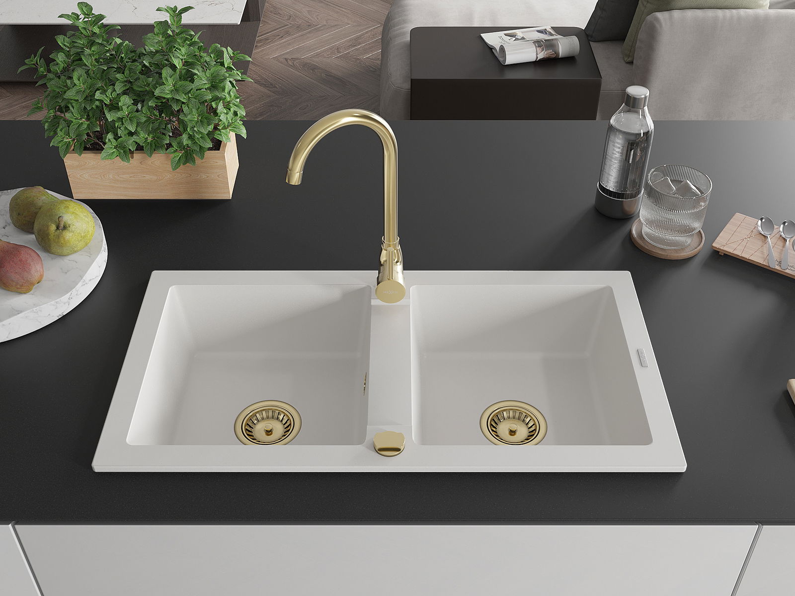 Mexen Mario zlewozmywak granitowy 2-komorowy 820 x 436 mm, biały, syfon złoty - 6504822000-20-G