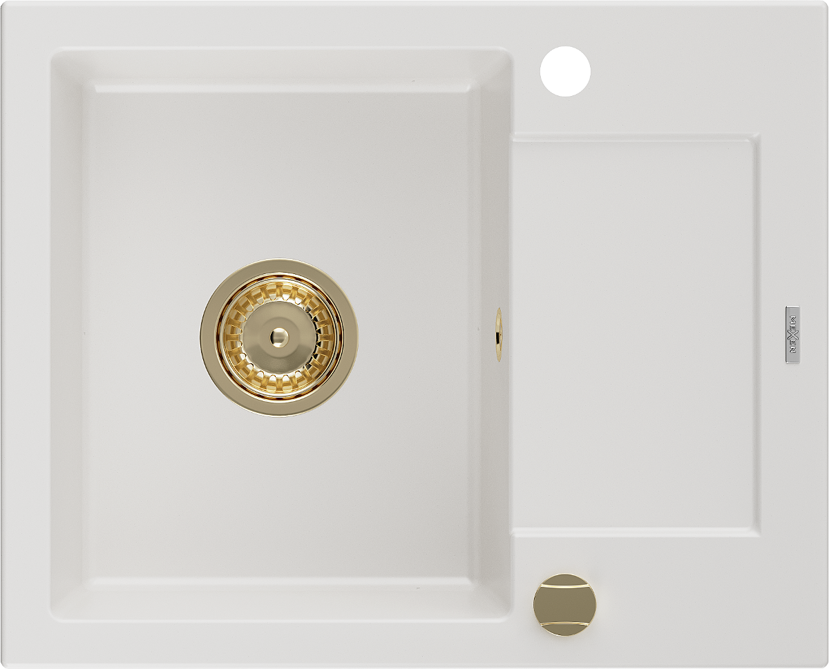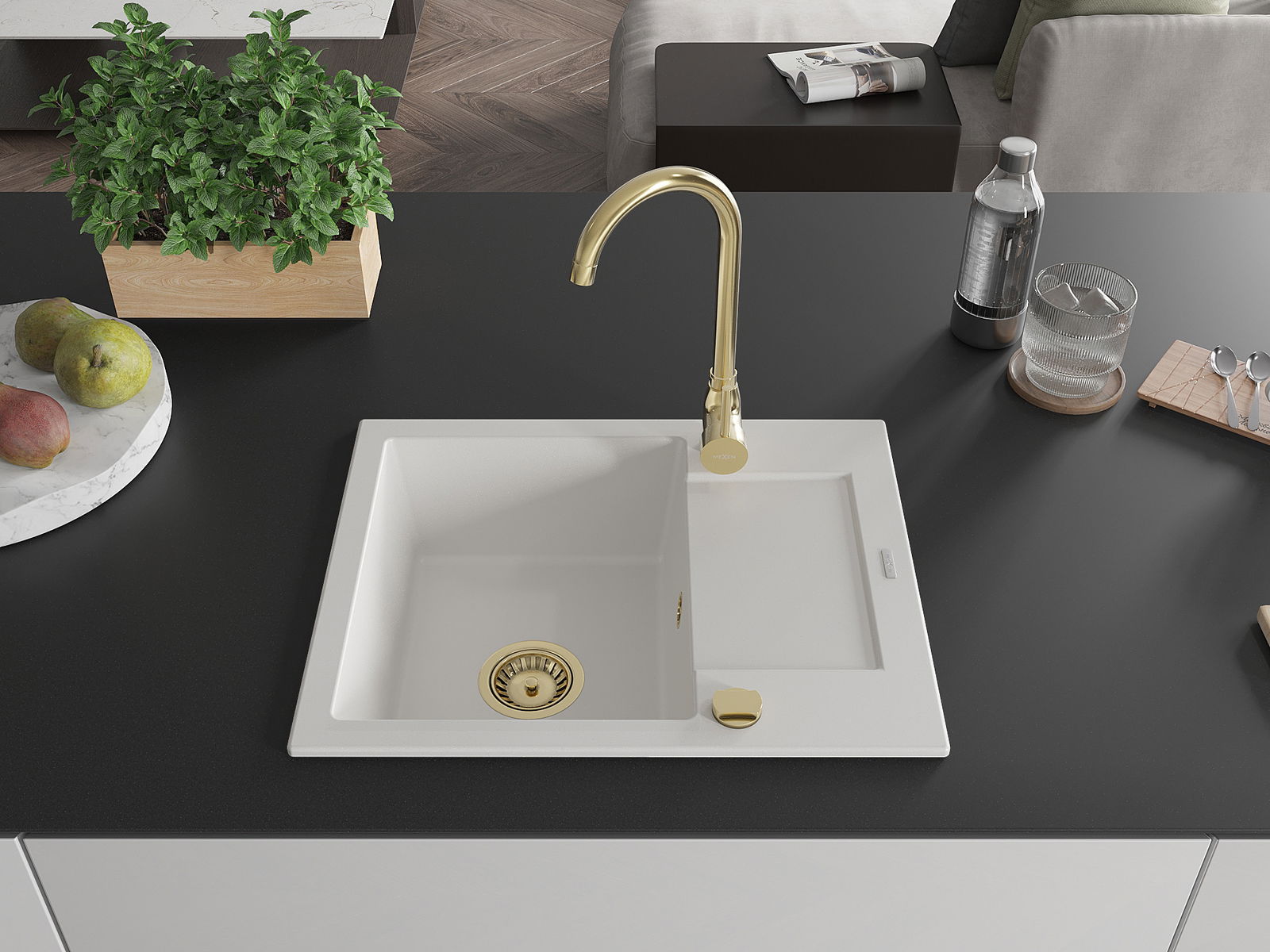 Mexen Enzo zlewozmywak granitowy 1-komorowy z ociekaczem 576 x 465 mm, biały, syfon złoty - 6506571005-20-G