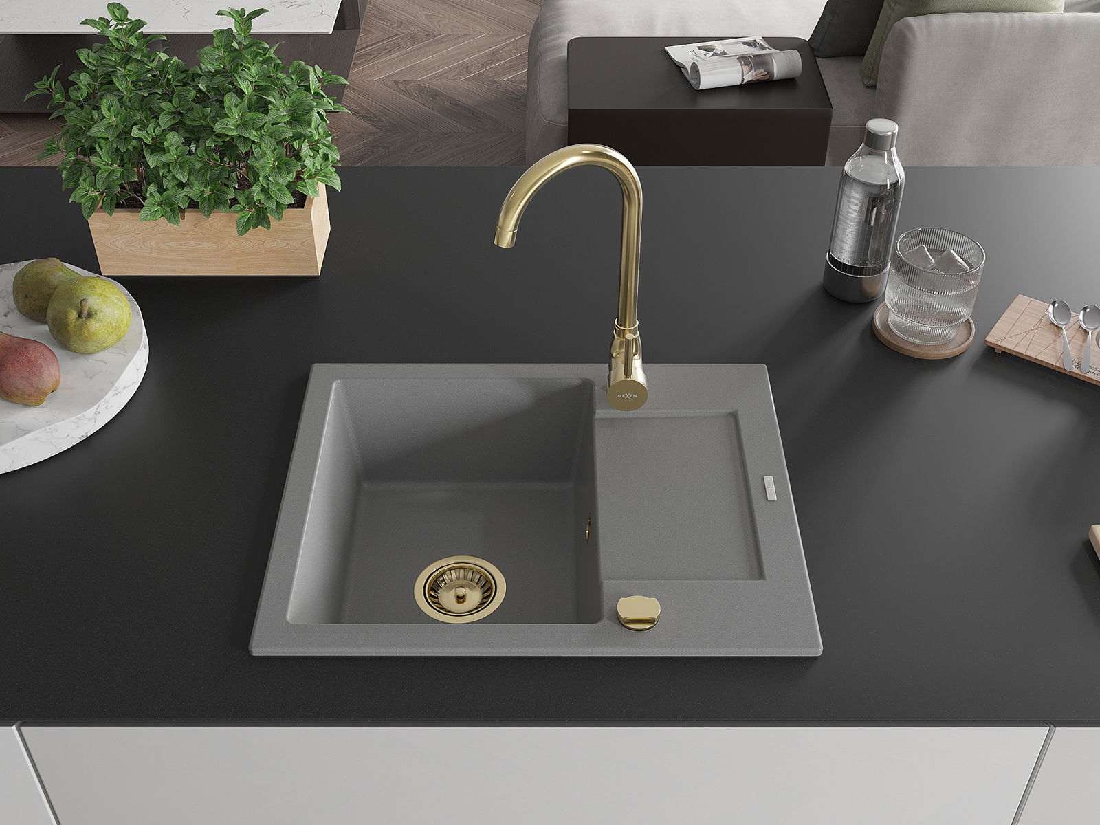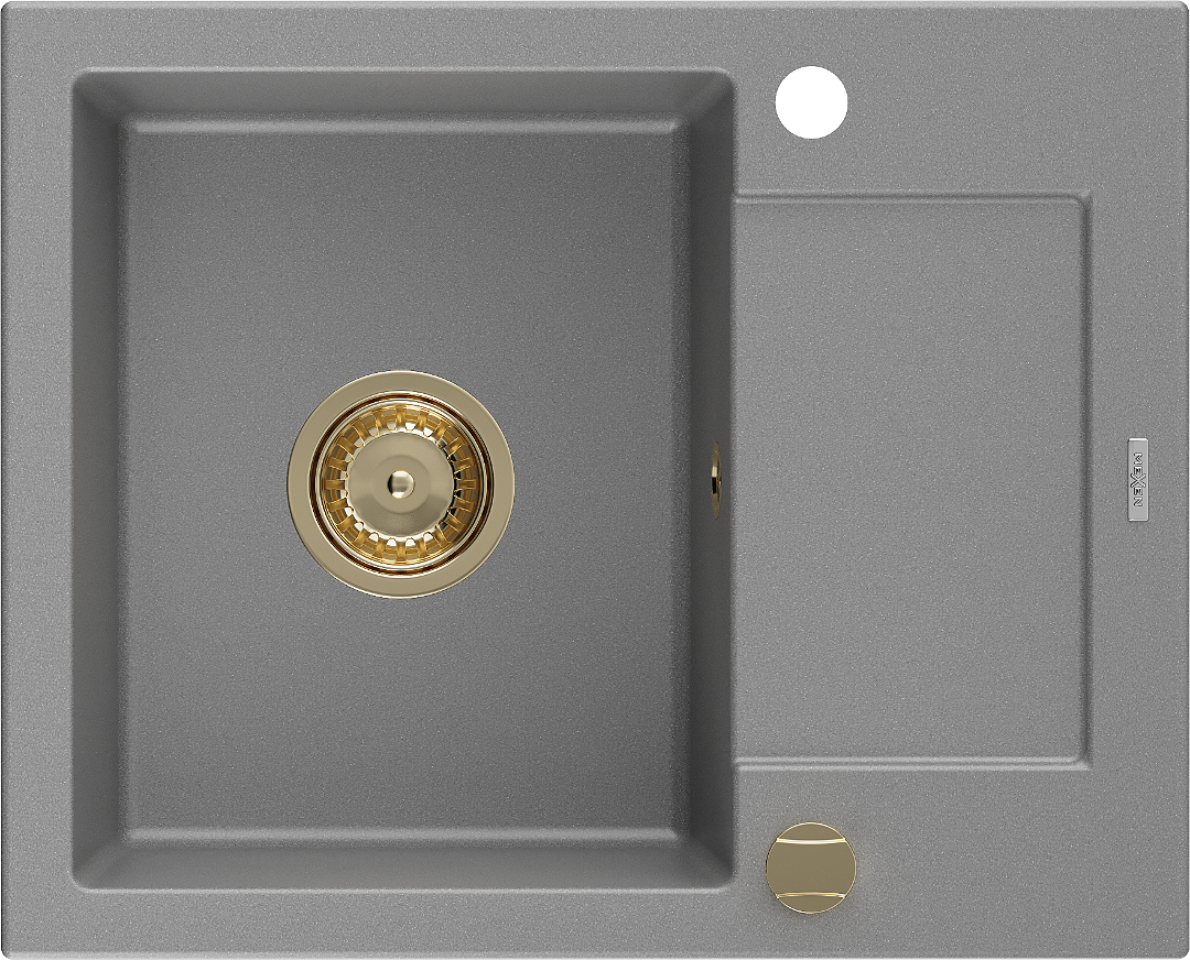 Mexen Enzo zlewozmywak granitowy 1-komorowy z ociekaczem 576 x 465 mm, szary, syfon złoty - 6506571005-71-G