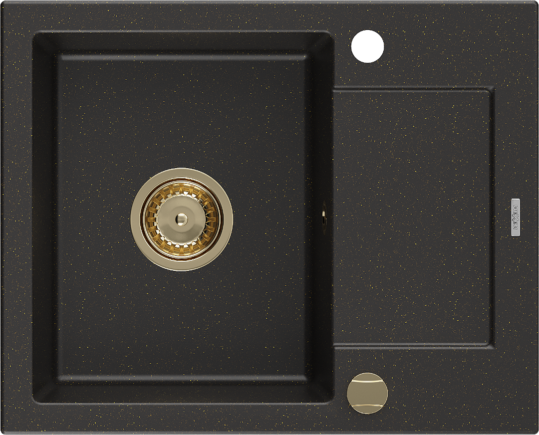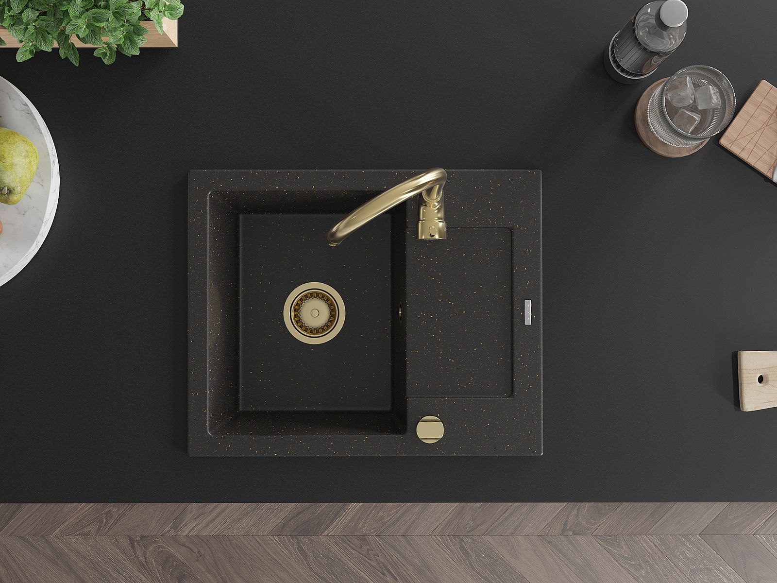 Mexen Enzo zlewozmywak granitowy 1-komorowy z ociekaczem 576 x 465 mm, czarny/złoty metalik, syfon złoty - 6506571005-75-G