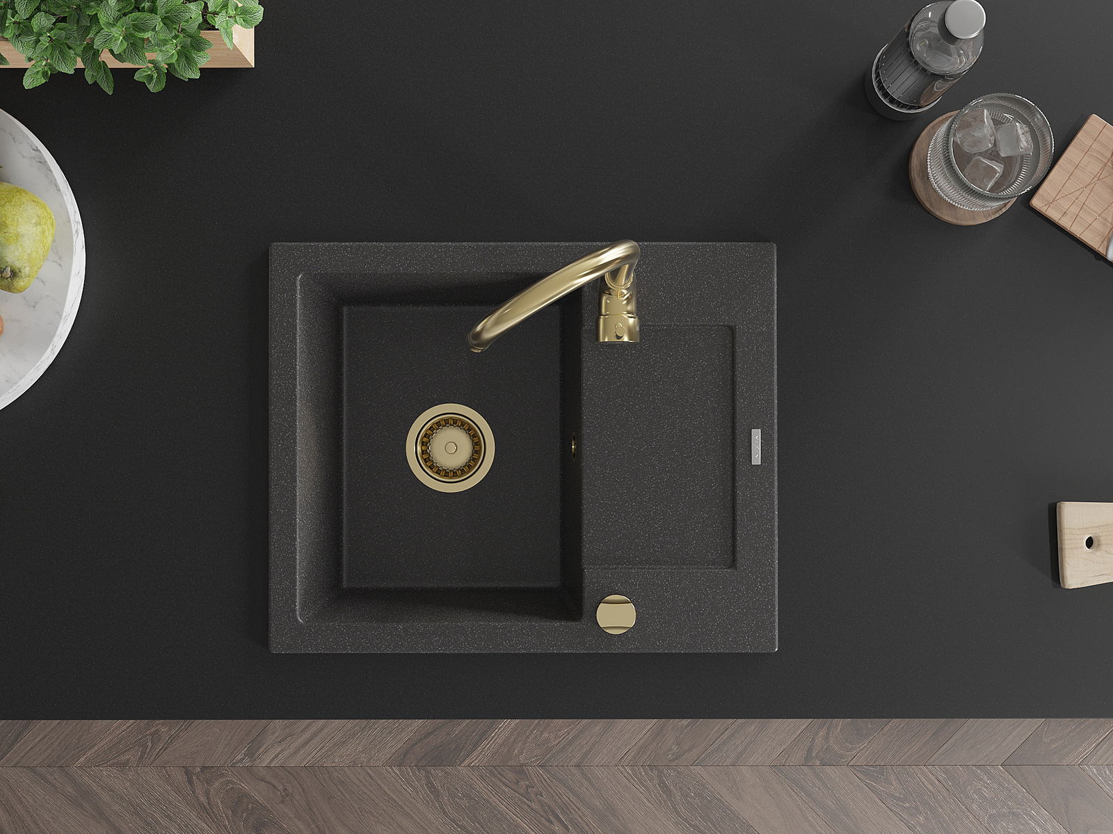 Mexen Enzo zlewozmywak granitowy 1-komorowy z ociekaczem 576 x 465 mm, czarny nakrapiany, syfon złoty - 6506571005-76-G