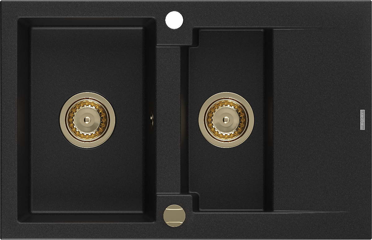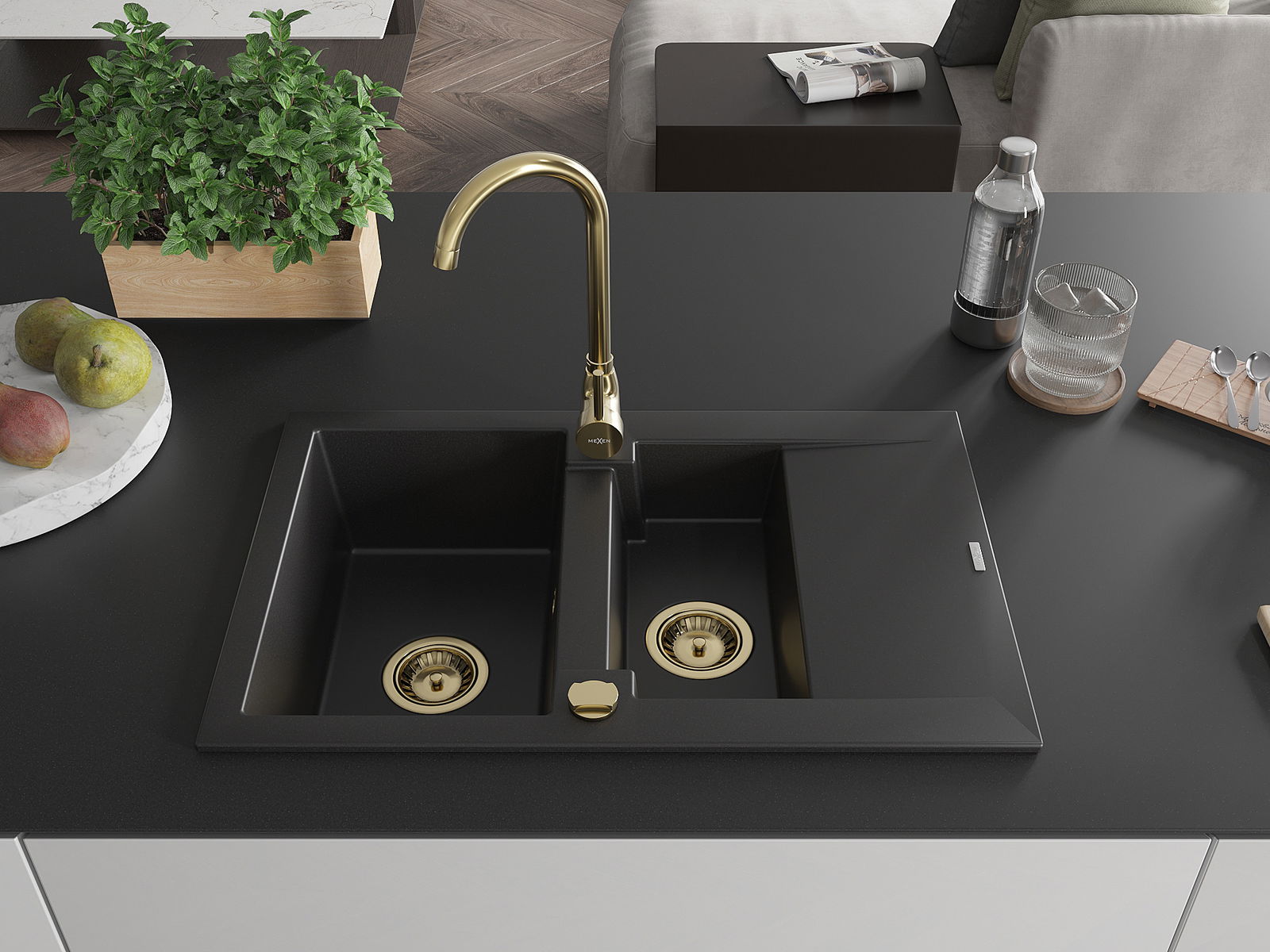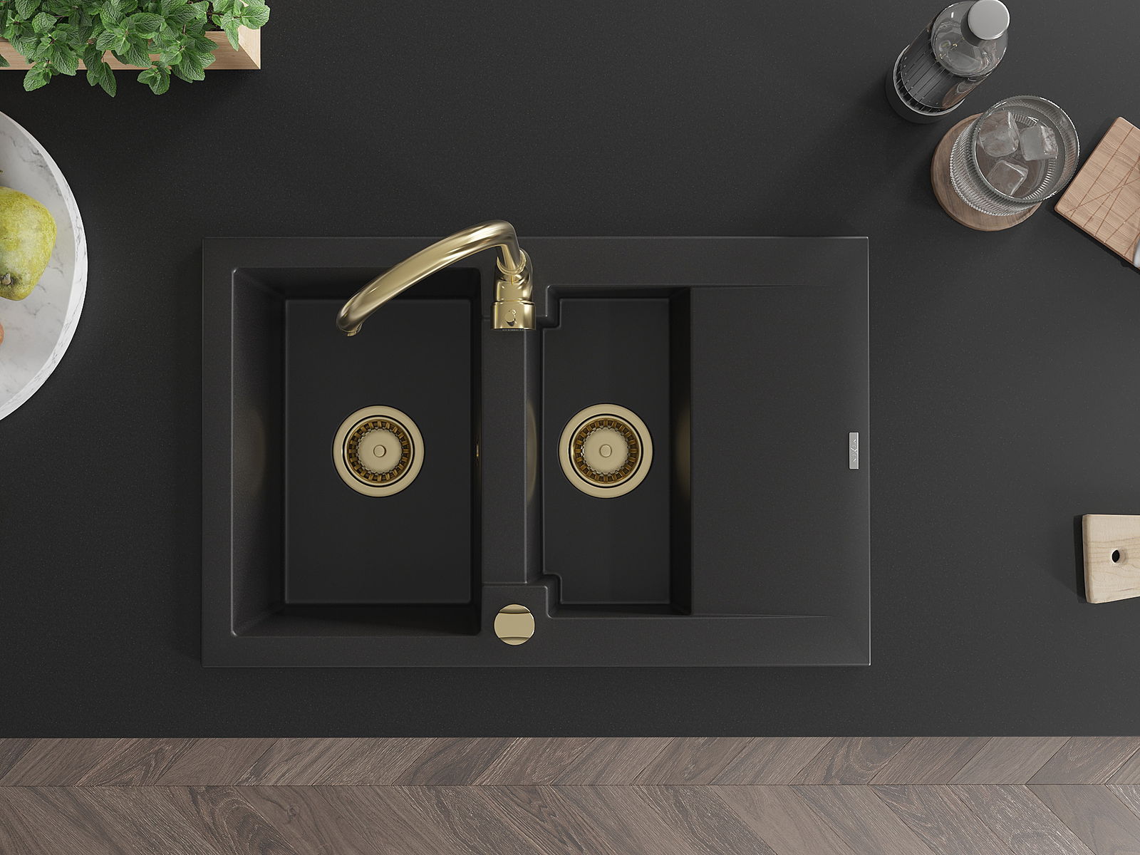 Mexen Gaspar zlewozmywak granitowy 1,5-komorowy z ociekaczem 737 x 475 mm, czarny, syfon złoty - 6507731505-77-G