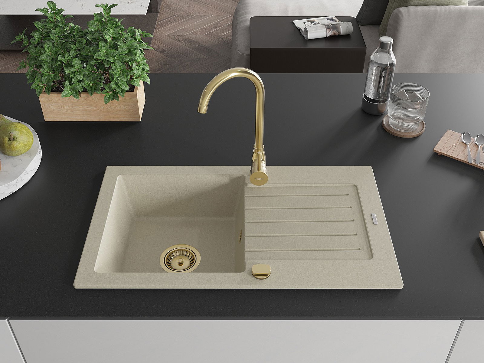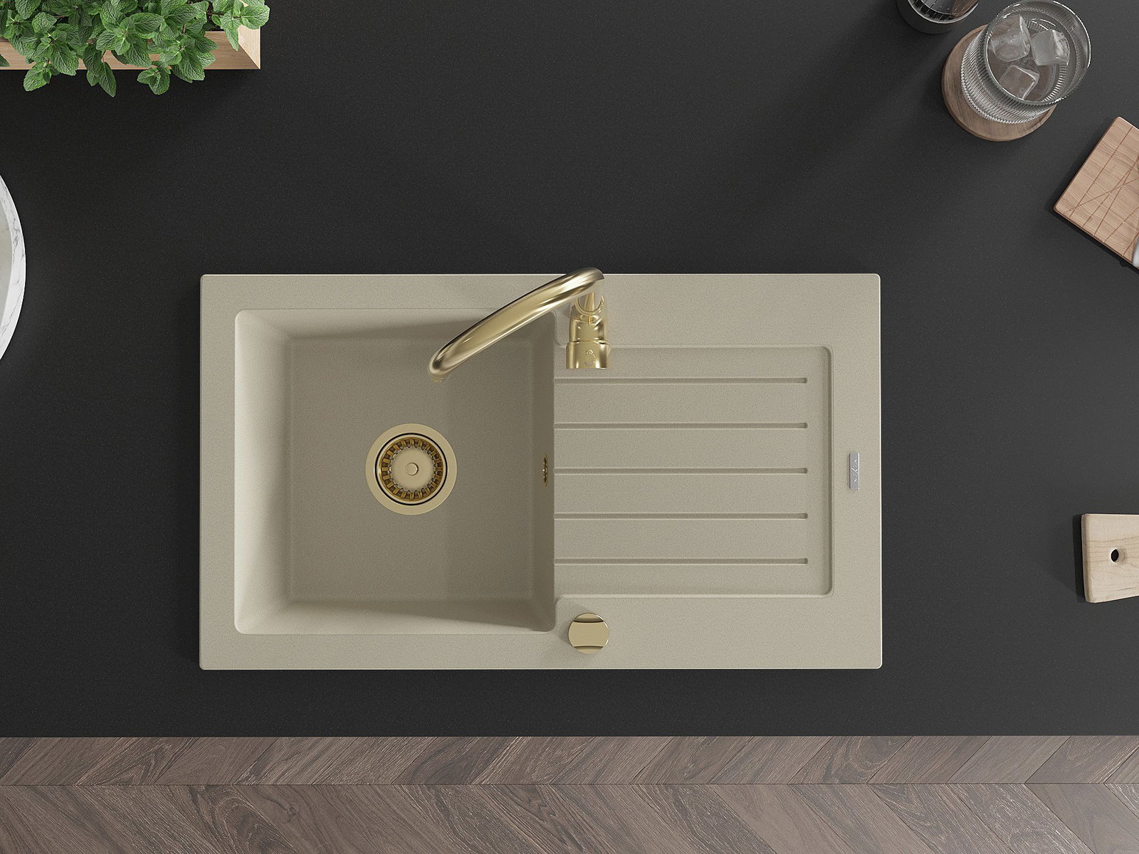Mexen Pablo zlewozmywak granitowy 1-komorowy z ociekaczem 752 x 436 mm, beżowy, syfon złoty - 6510751010-69-G