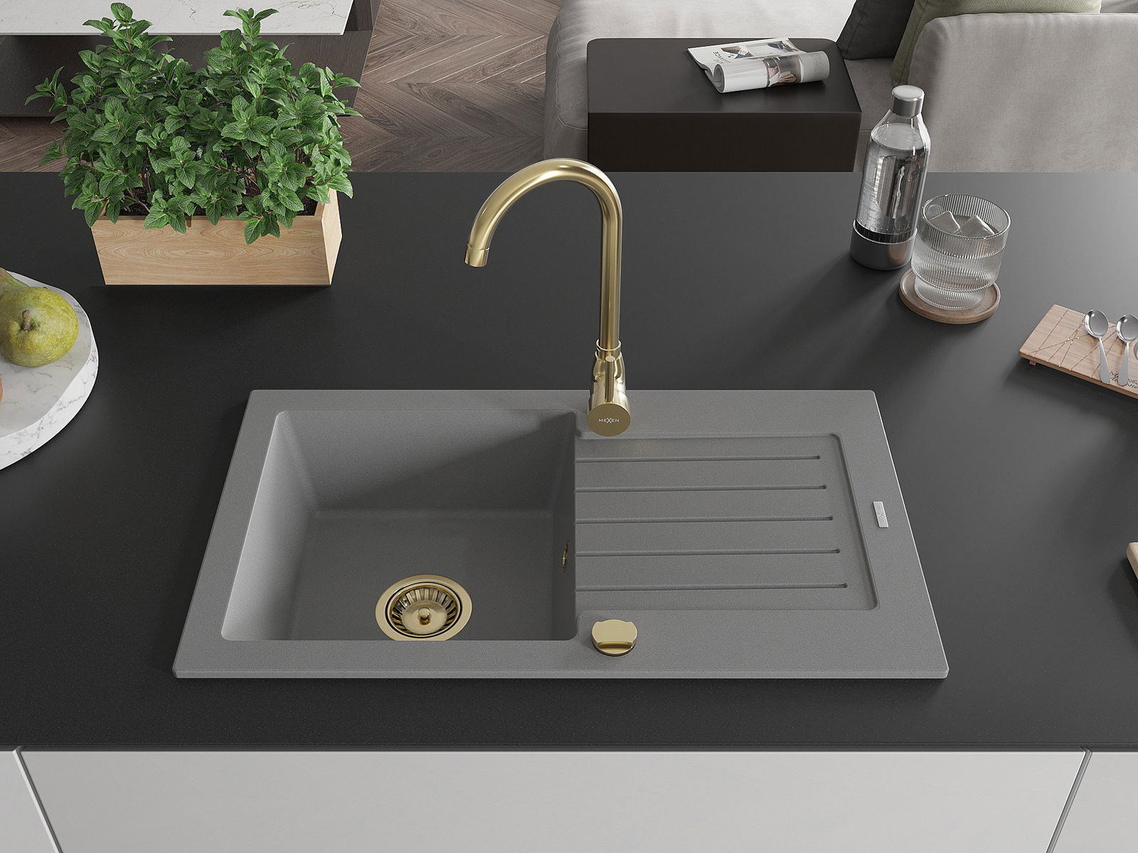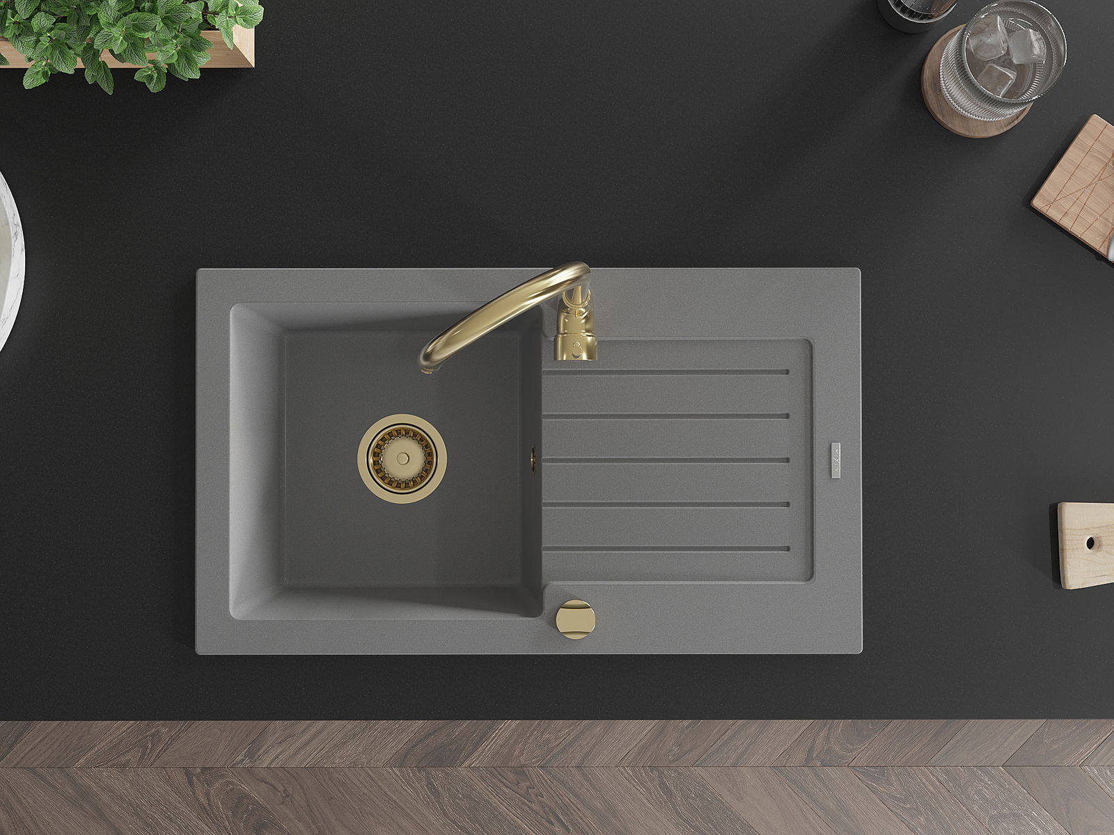 Mexen Pablo zlewozmywak granitowy 1-komorowy z ociekaczem 752 x 436 mm, szary, syfon złoty - 6510751010-71-G