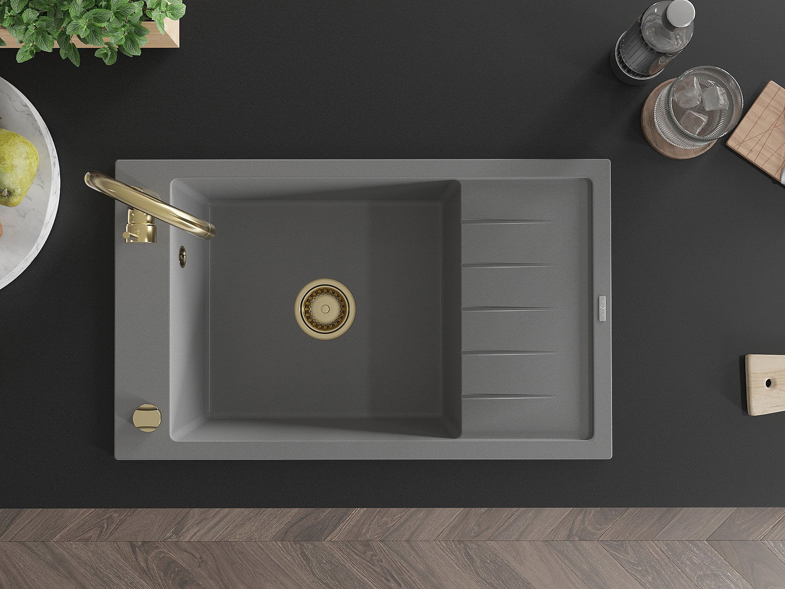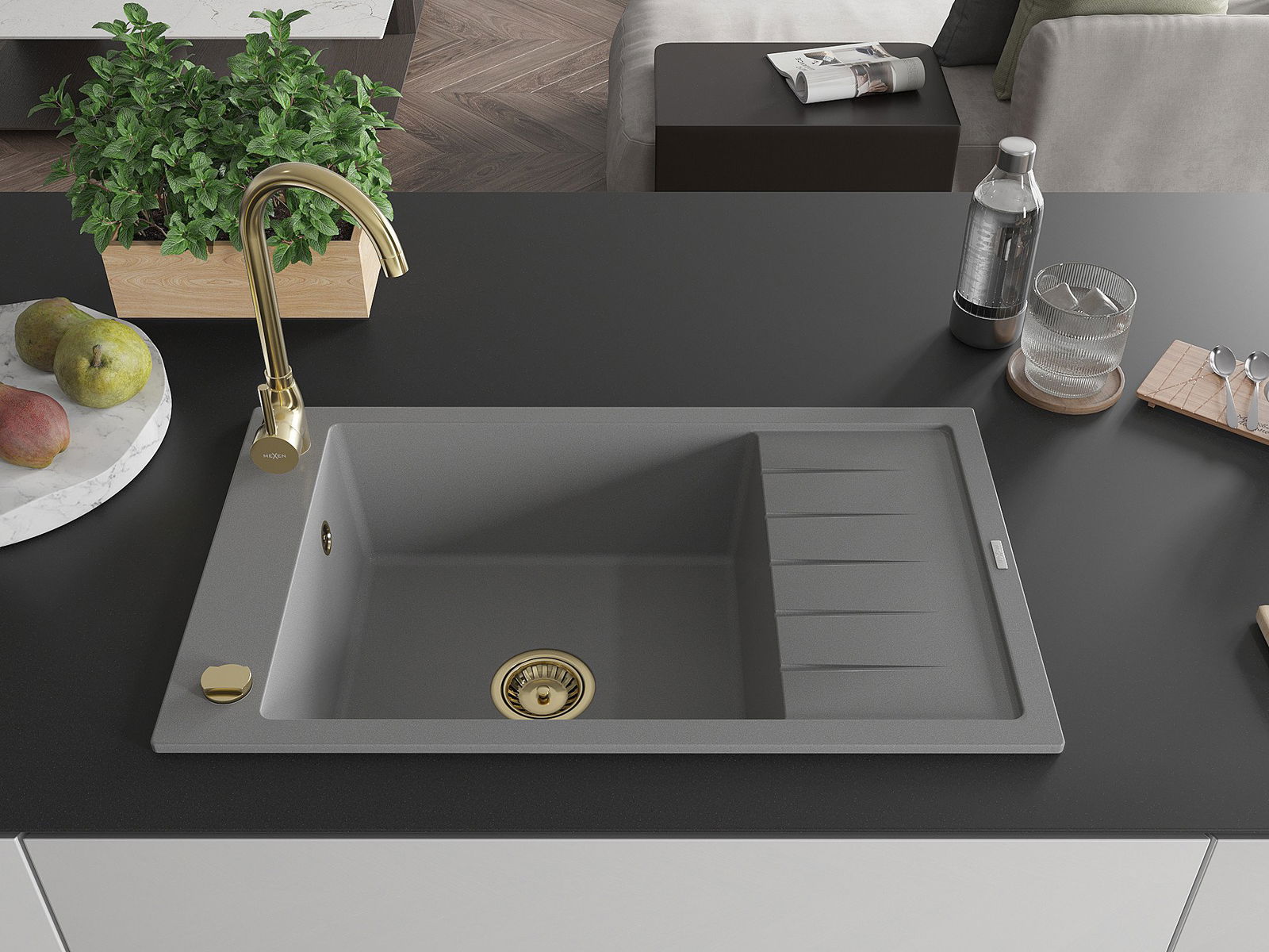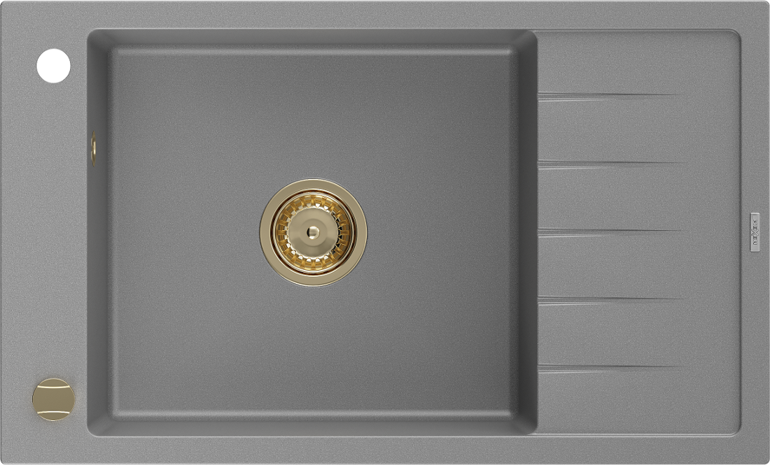 Mexen Elias zlewozmywak granitowy 1-komorowy z ociekaczem 795 x 480 mm, szary, syfon złoty - 6511791005-71-G