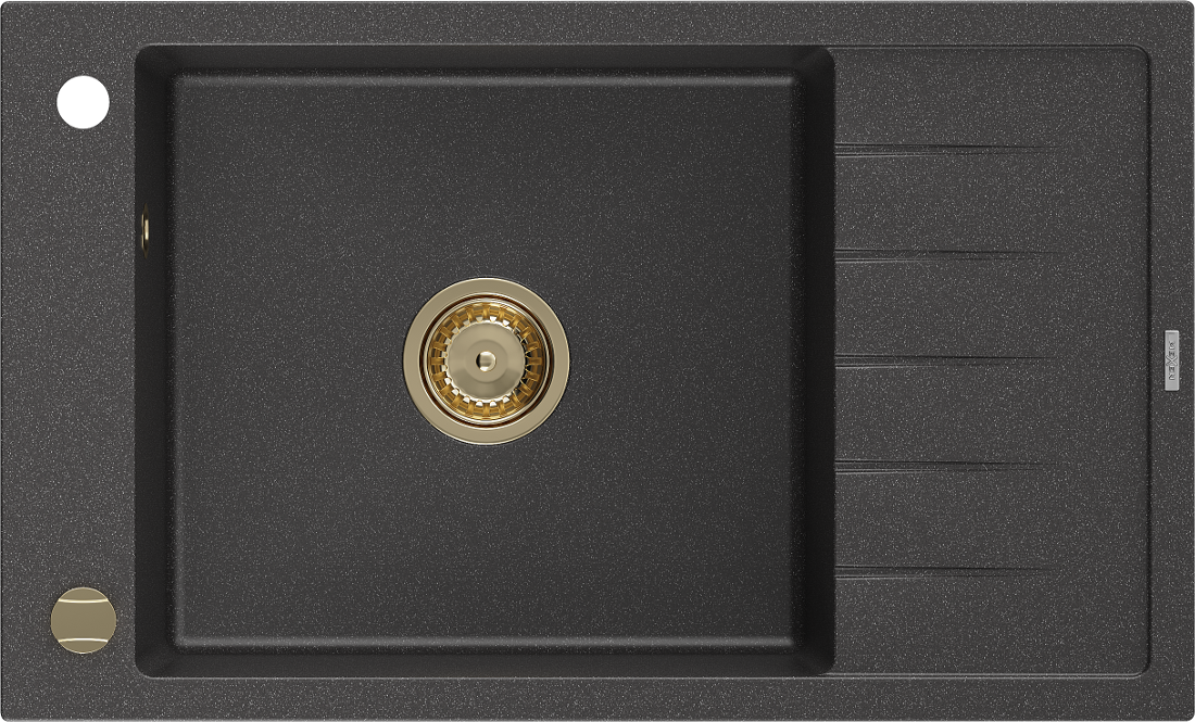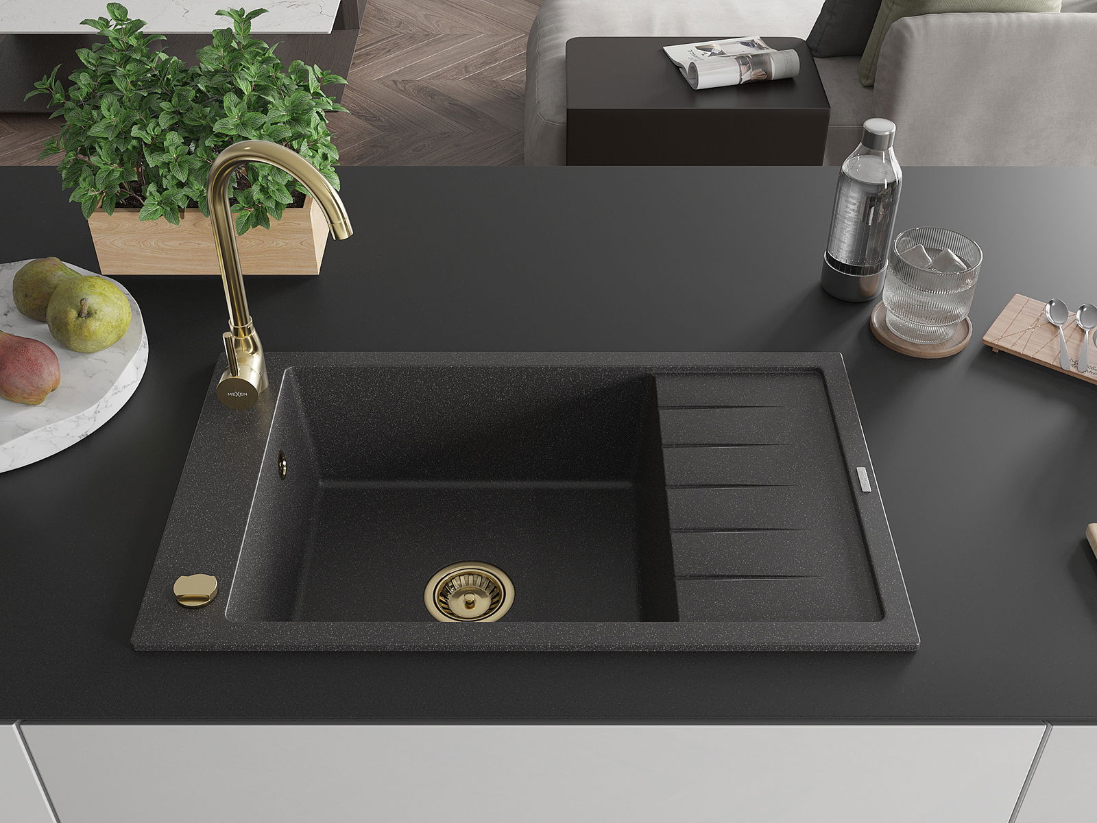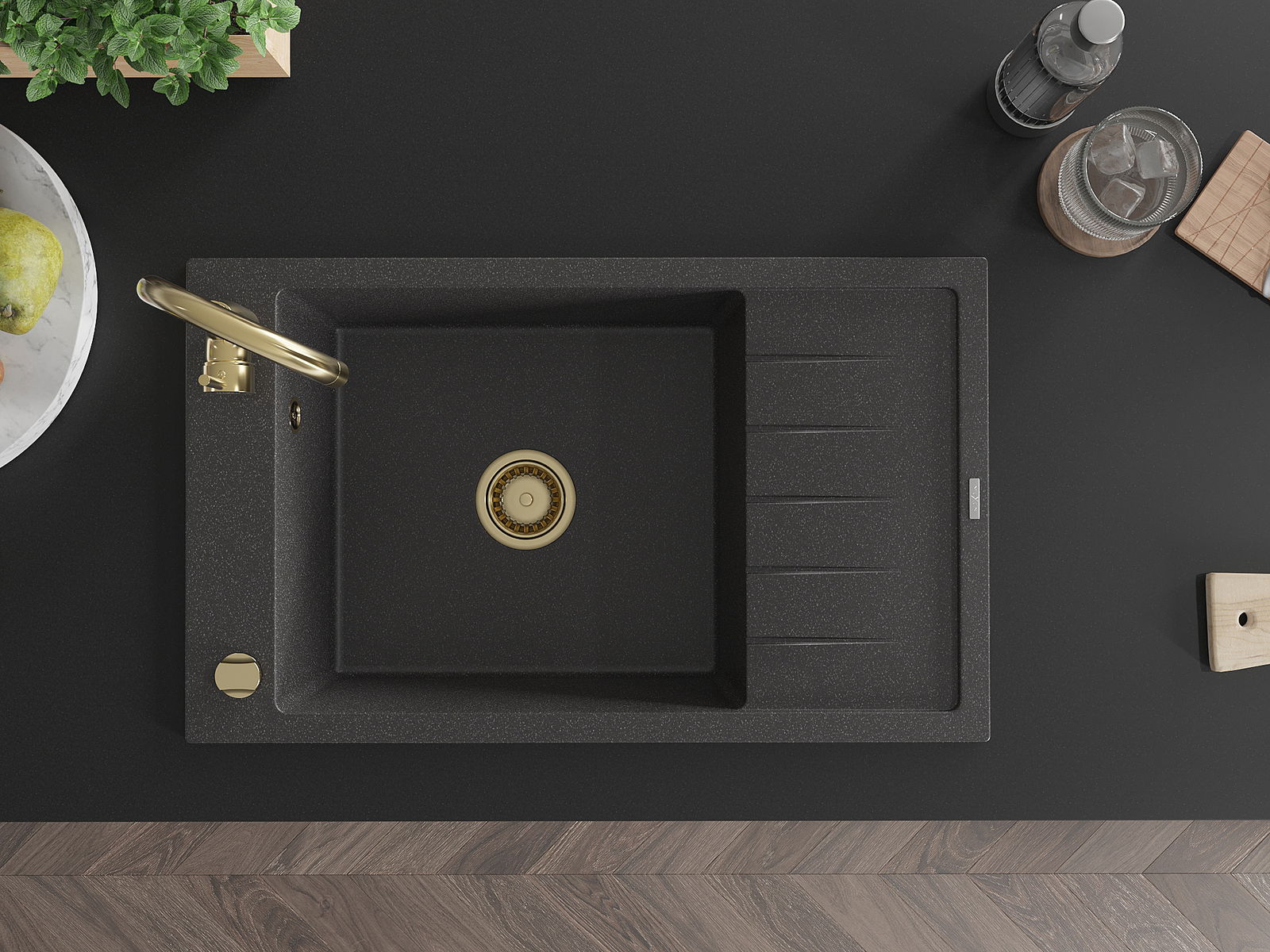 Mexen Elias zlewozmywak granitowy 1-komorowy z ociekaczem 795 x 480 mm, czarny nakrapiany, syfon złoty - 6511791005-76-G