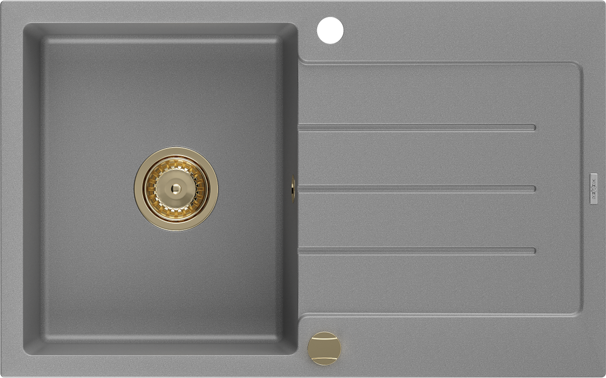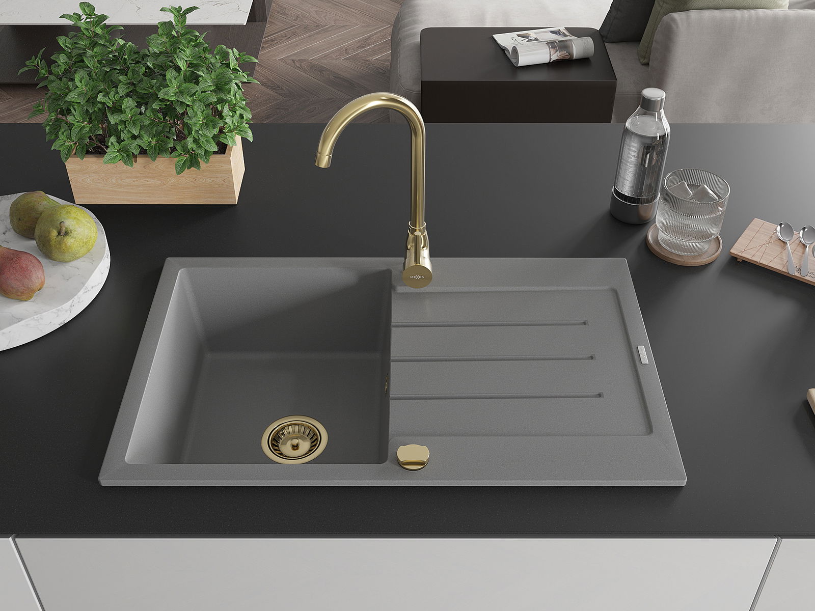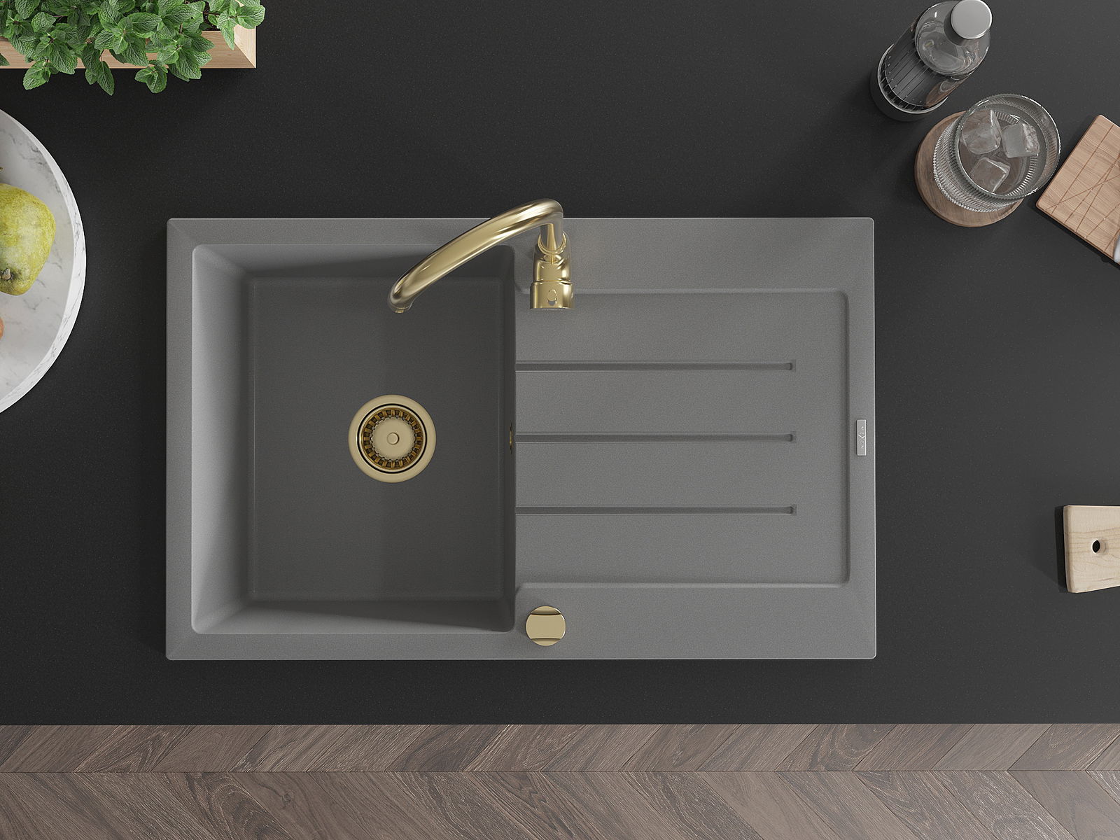 Mexen Bruno zlewozmywak granitowy 1-komorowy z ociekaczem 795 x 495 mm, szary, syfon złoty - 6513791010-71-G