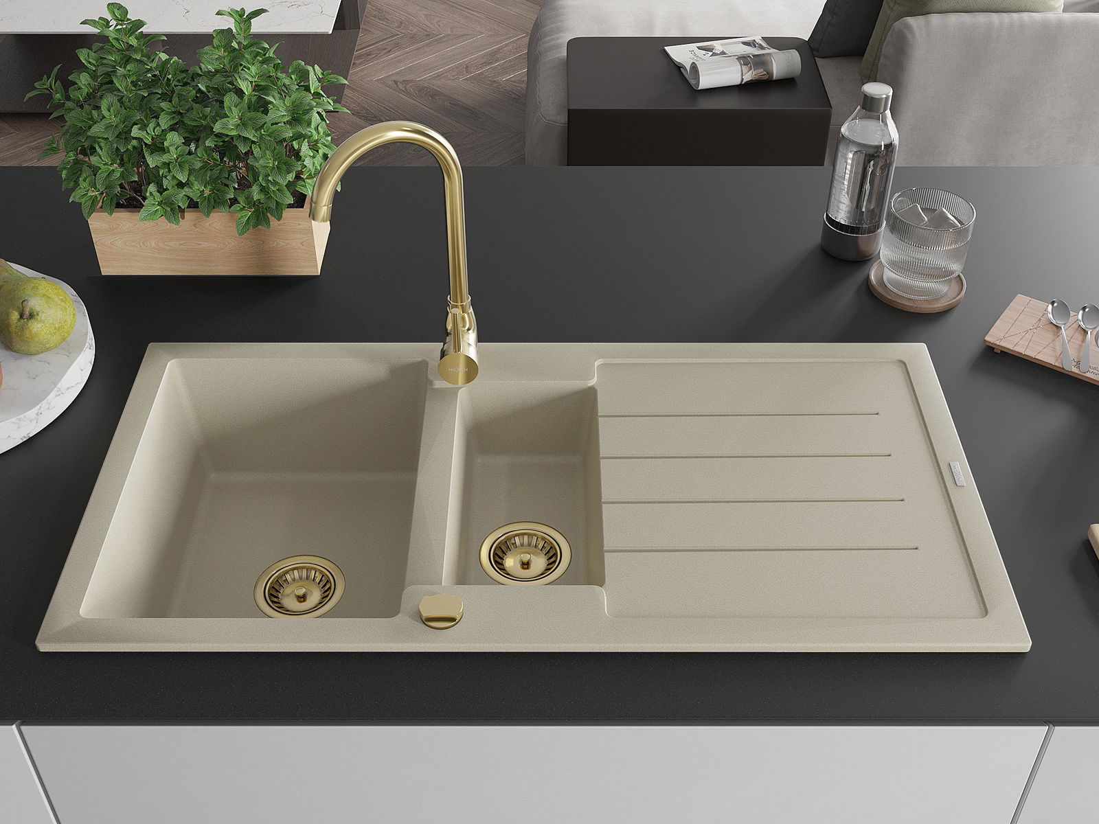 Mexen Andres zlewozmywak granitowy 1,5-komorowy z ociekaczem 1000 x 500 mm, beżowy, syfon złoty - 6515101510-69-G