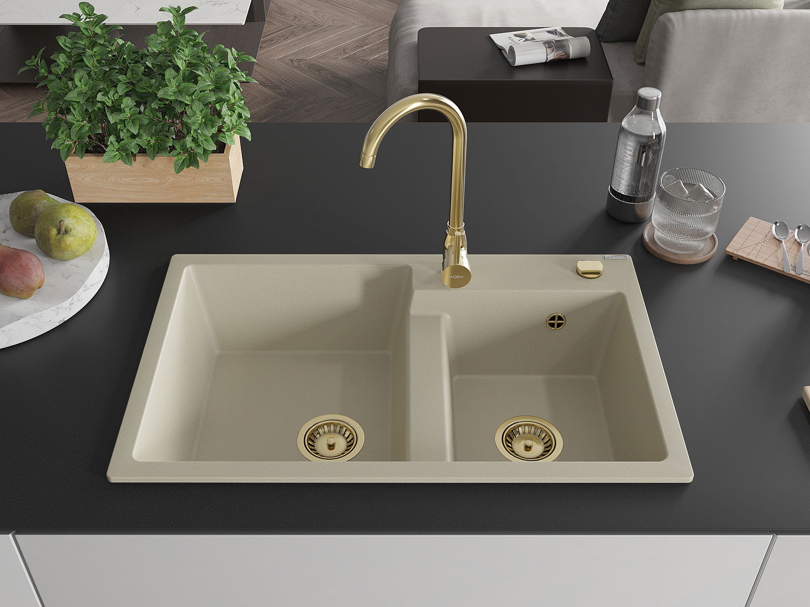 Mexen Tomas zlewozmywak granitowy 2-komorowy 800 x 500 mm, beżowy, syfon złoty - 6516802000-69-G