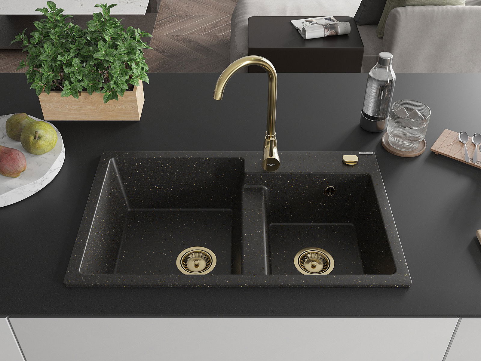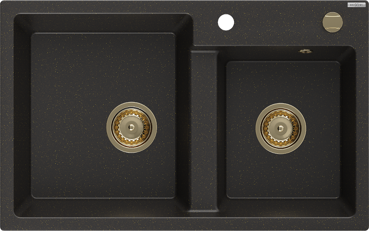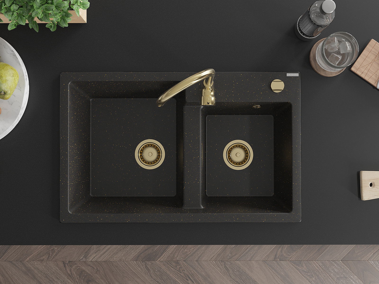 Mexen Tomas zlewozmywak granitowy 2-komorowy 800 x 500 mm, czarny/złoty metalik, syfon złoty - 6516802000-75-G