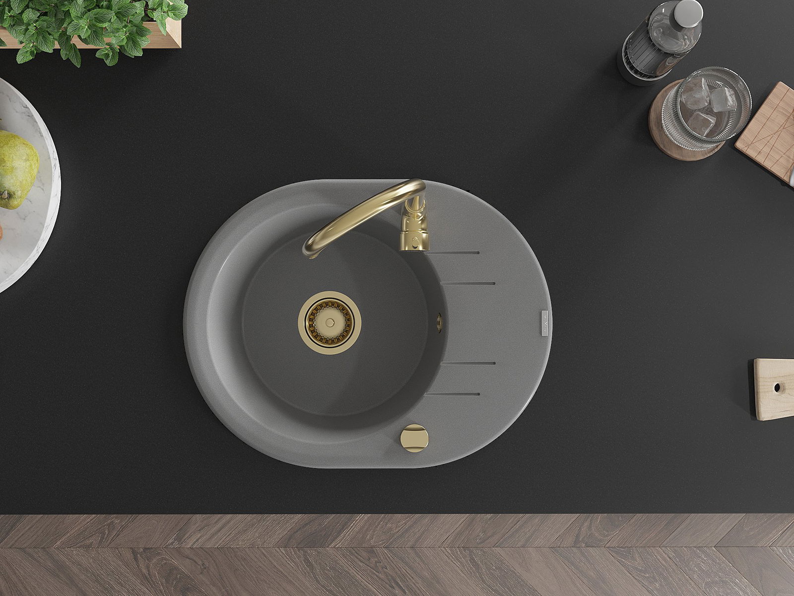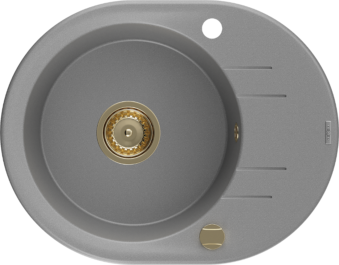 Mexen Kevin zlewozmywak granitowy 1-komorowy z ociekaczem 586 x 458 mm, szary, syfon złoty - 6517581005-71-G