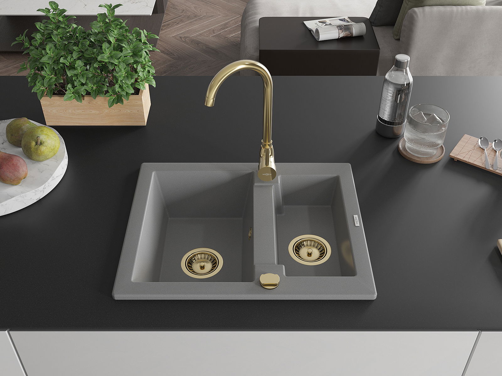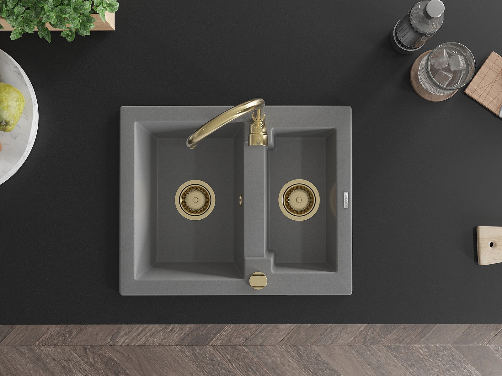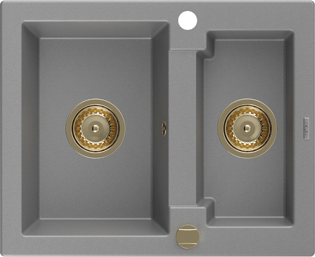 Mexen Carlos zlewozmywak granitowy 1,5-komorowy 582 x 475 mm, szary, syfon złoty - 6518581500-71-G