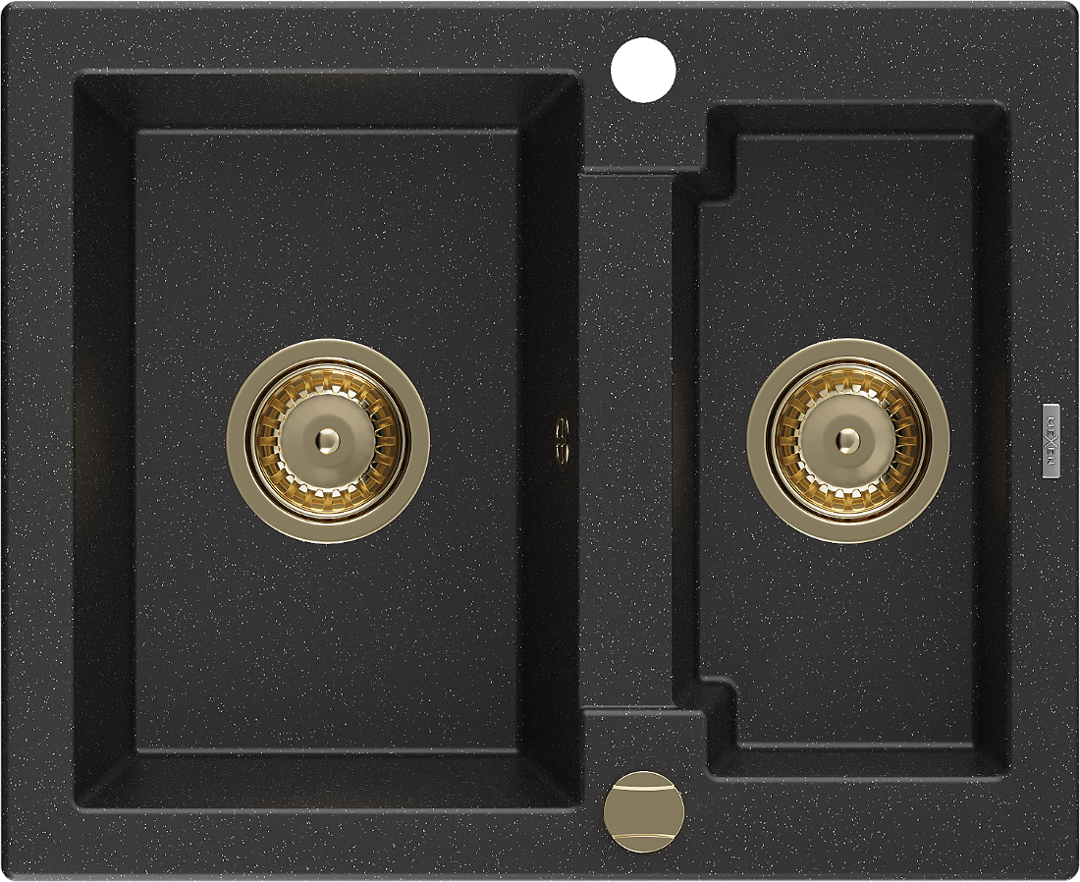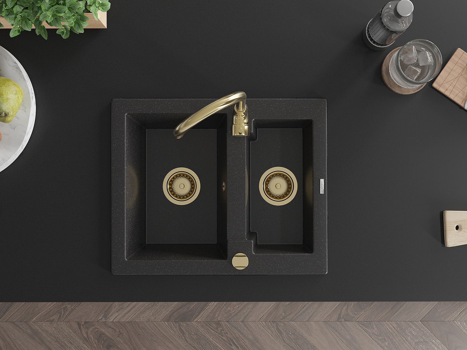 Mexen Carlos zlewozmywak granitowy 1,5-komorowy 582 x 475 mm, czarny/srebrny metalik, syfon złoty - 6518581500-73-G