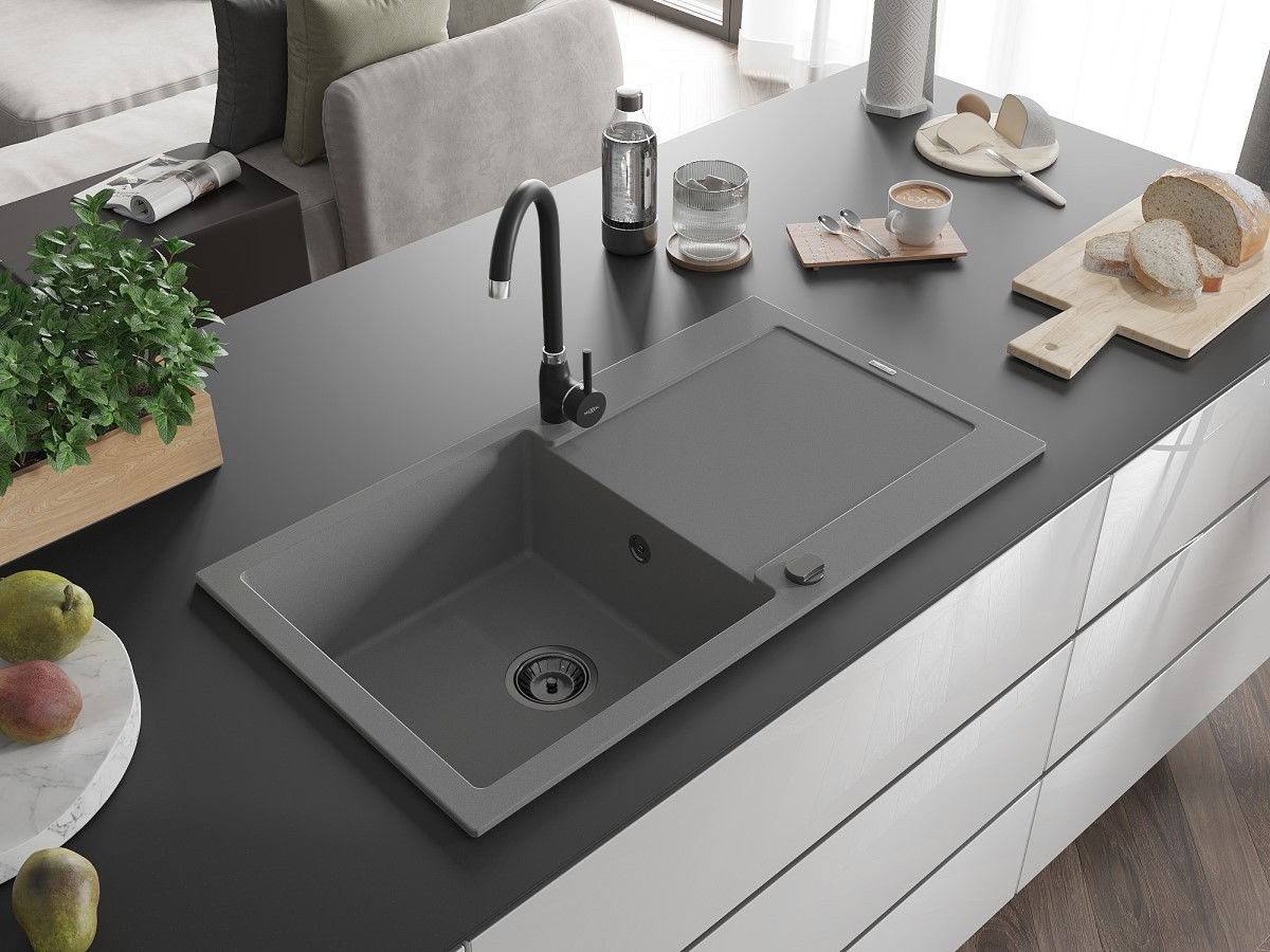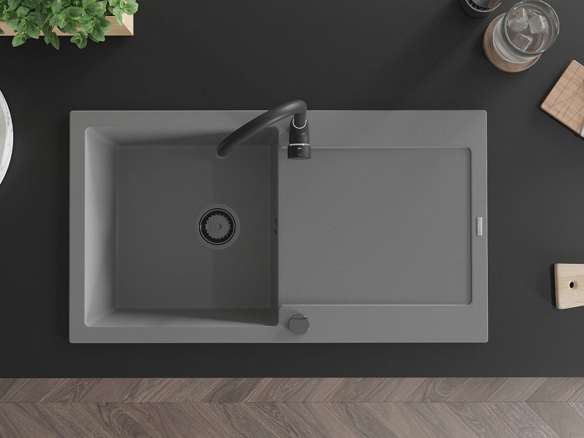 Mexen Leo zlewozmywak granitowy 1-komorowy z ociekaczem 900 x 500 mm, szary, syfon czarny - 6501901010-71-B