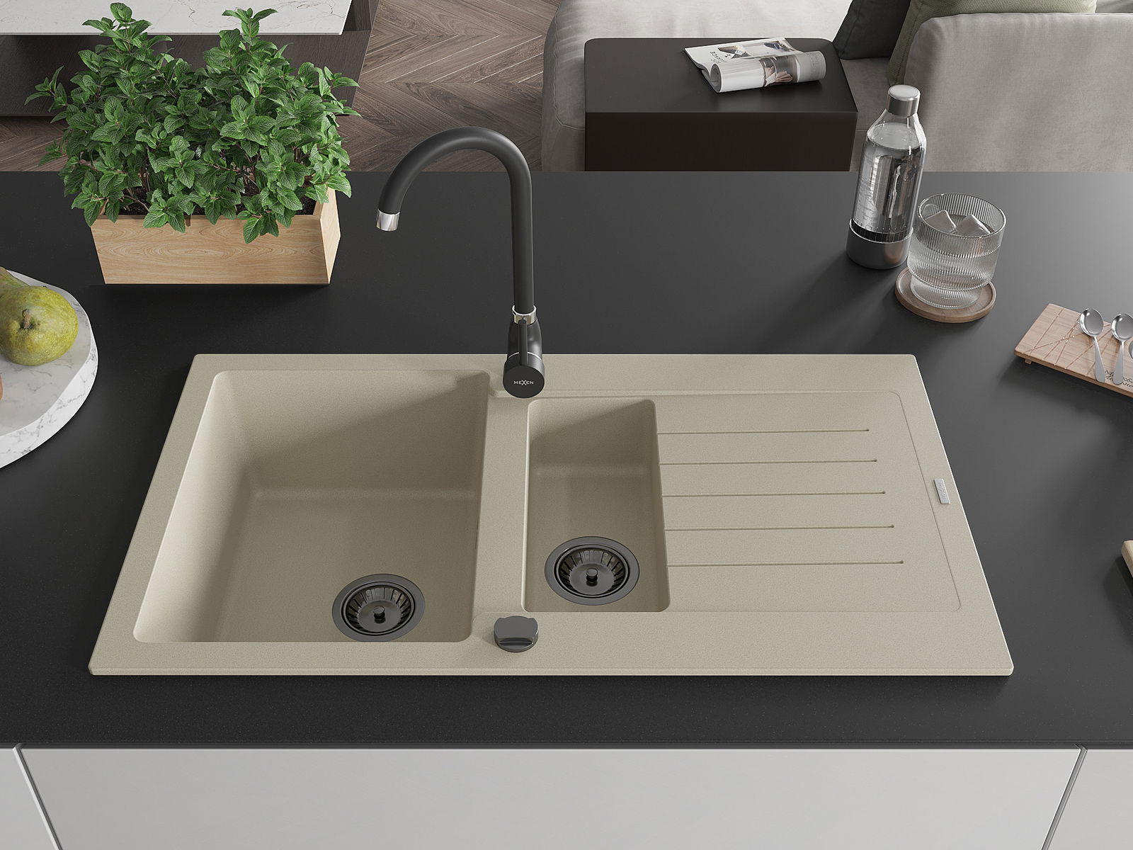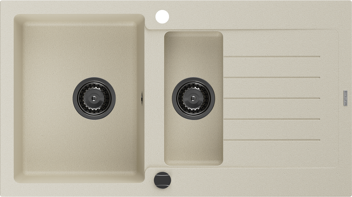Mexen Matias zlewozmywak granitowy 1,5-komorowy z ociekaczem 900 x 505 mm, beżowy, syfon czarny - 6502901505-69-B