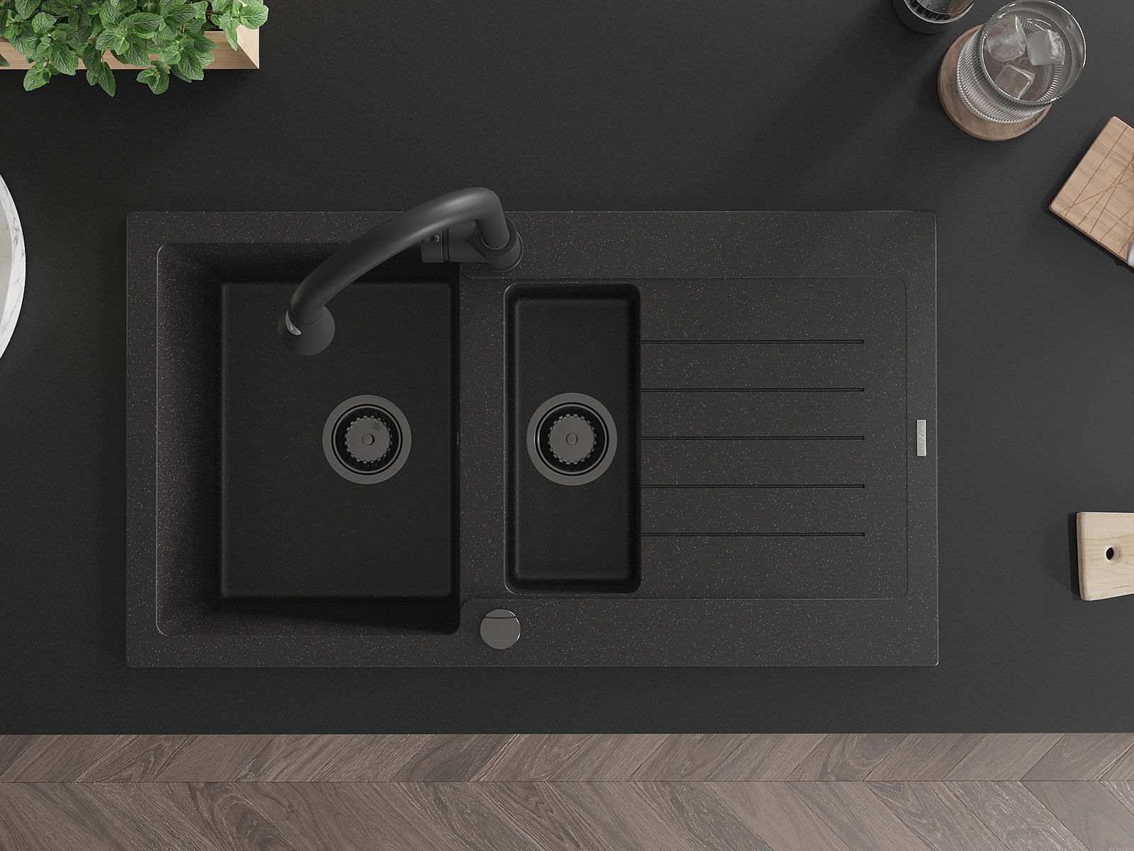 Mexen Matias zlewozmywak granitowy 1,5-komorowy z ociekaczem 900 x 505 mm czarny/srebrny metalik, syfon czarny - 6502901505-73-B