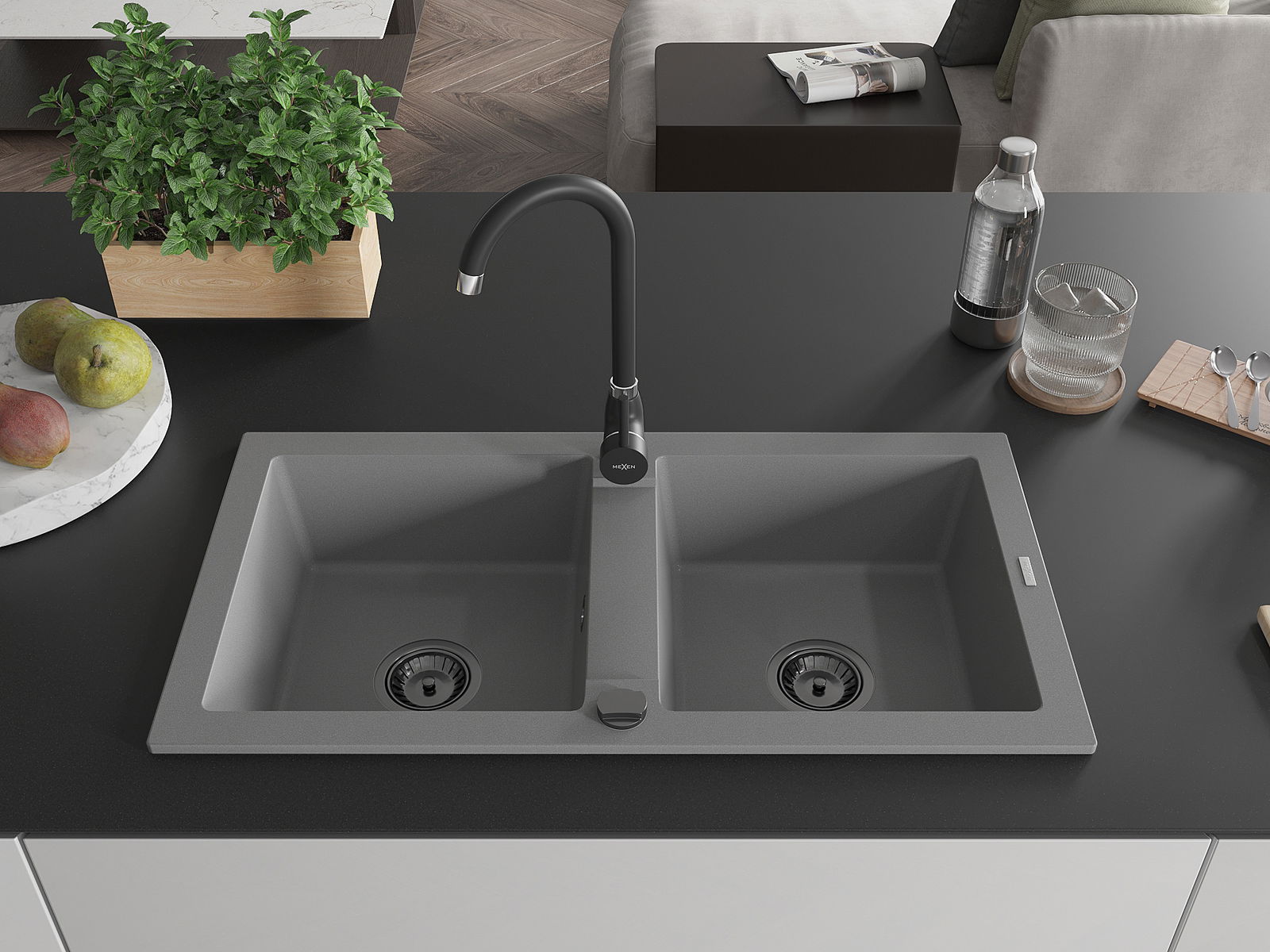 Mexen Mario zlewozmywak granitowy 2-komorowy 820 x 436 mm, szary, syfon czarny - 6504822000-71-B