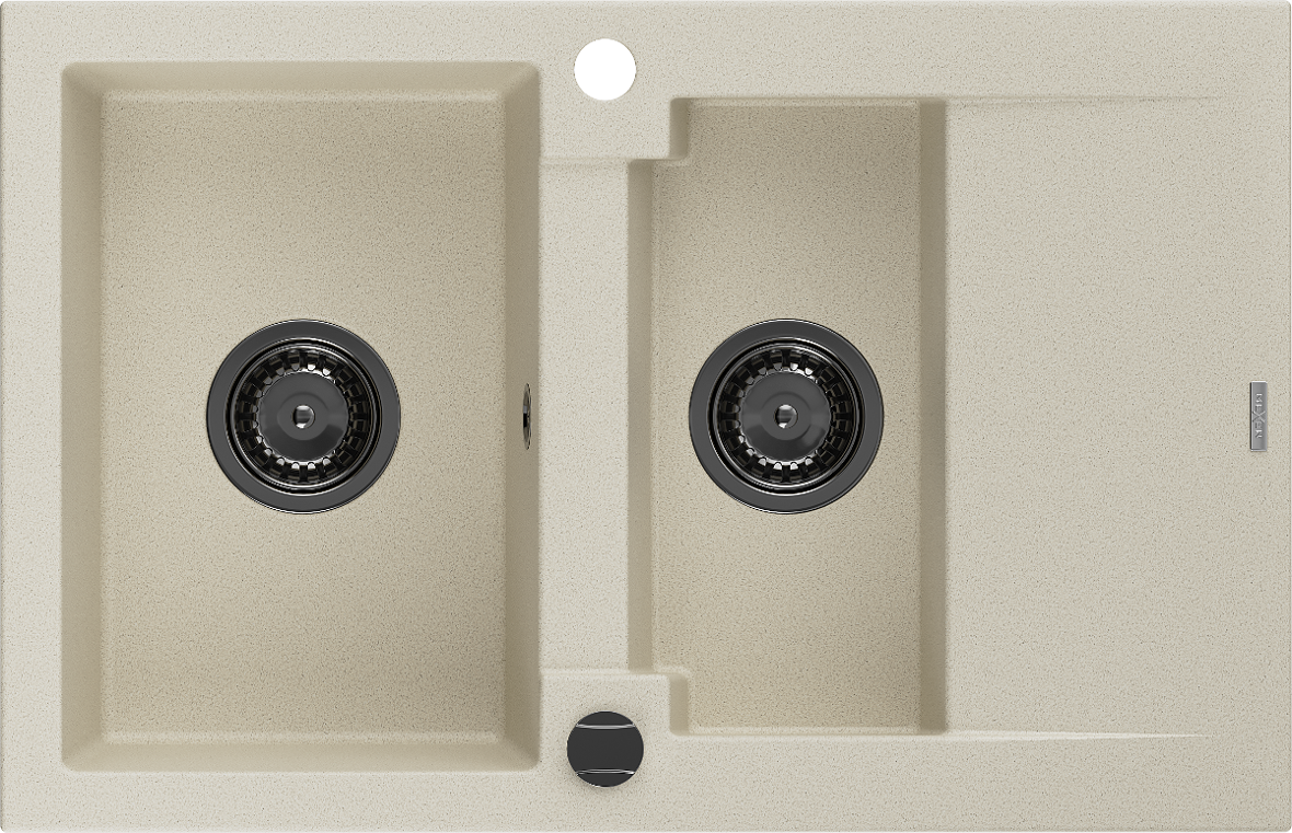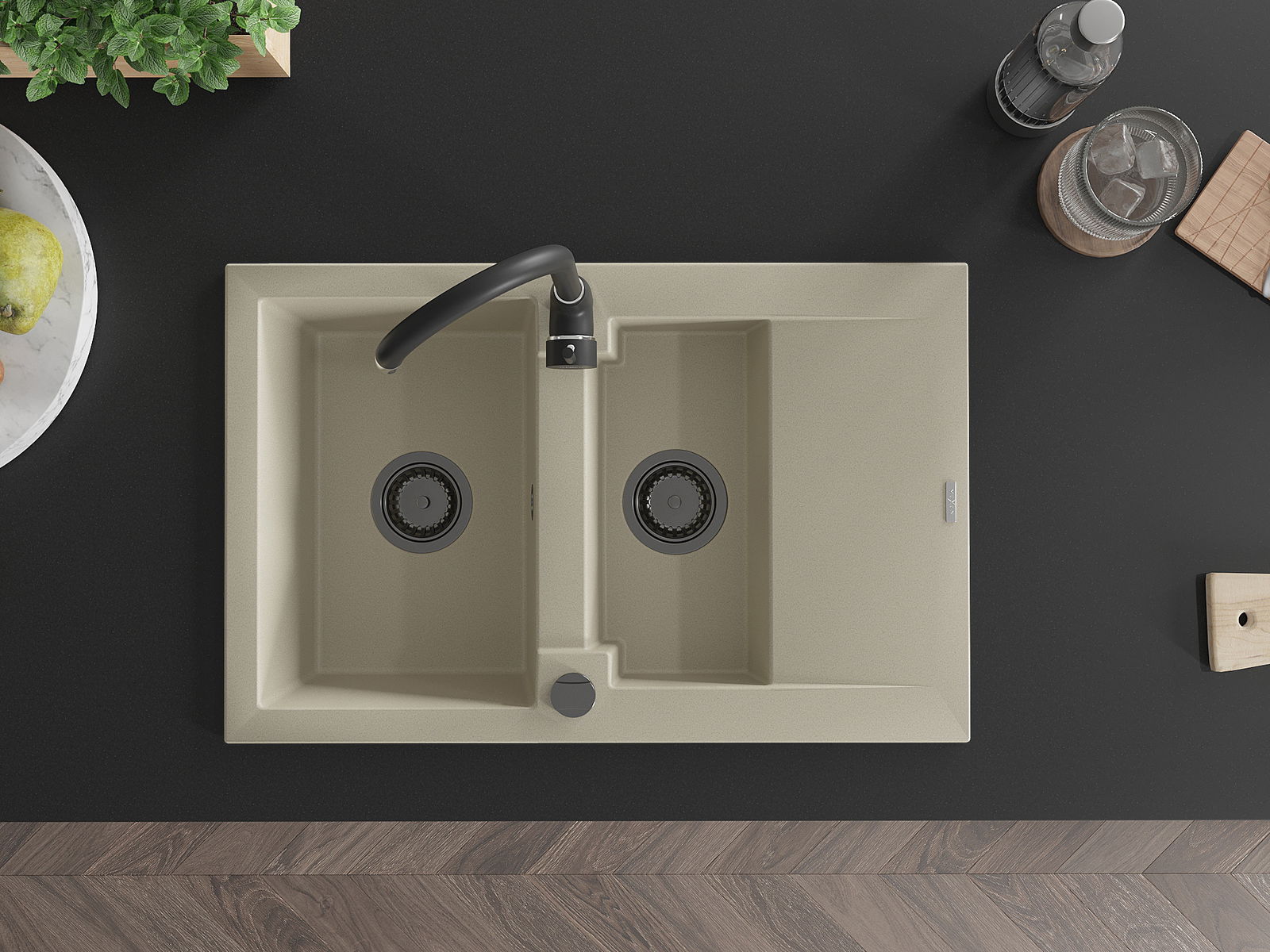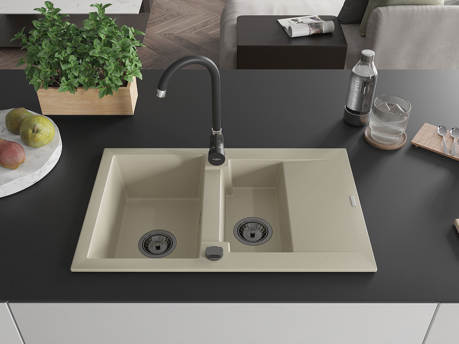 Mexen Gaspar zlewozmywak granitowy 1,5-komorowy z ociekaczem 737 x 475 mm, beżowy, syfon czarny - 6507731505-69-B