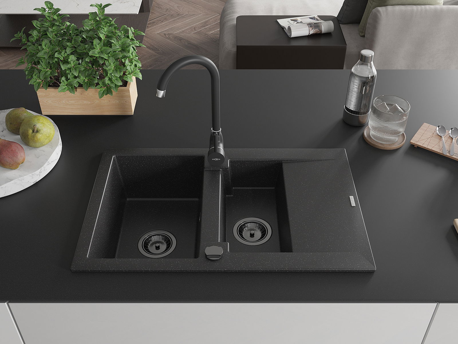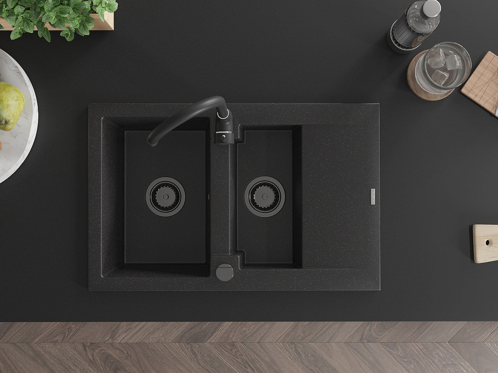 Mexen Gaspar zlewozmywak granitowy 1,5-komorowy z ociekaczem 737 x 475 mm czarny/srebrny metalik, syfon czarny - 6507731505-73-B