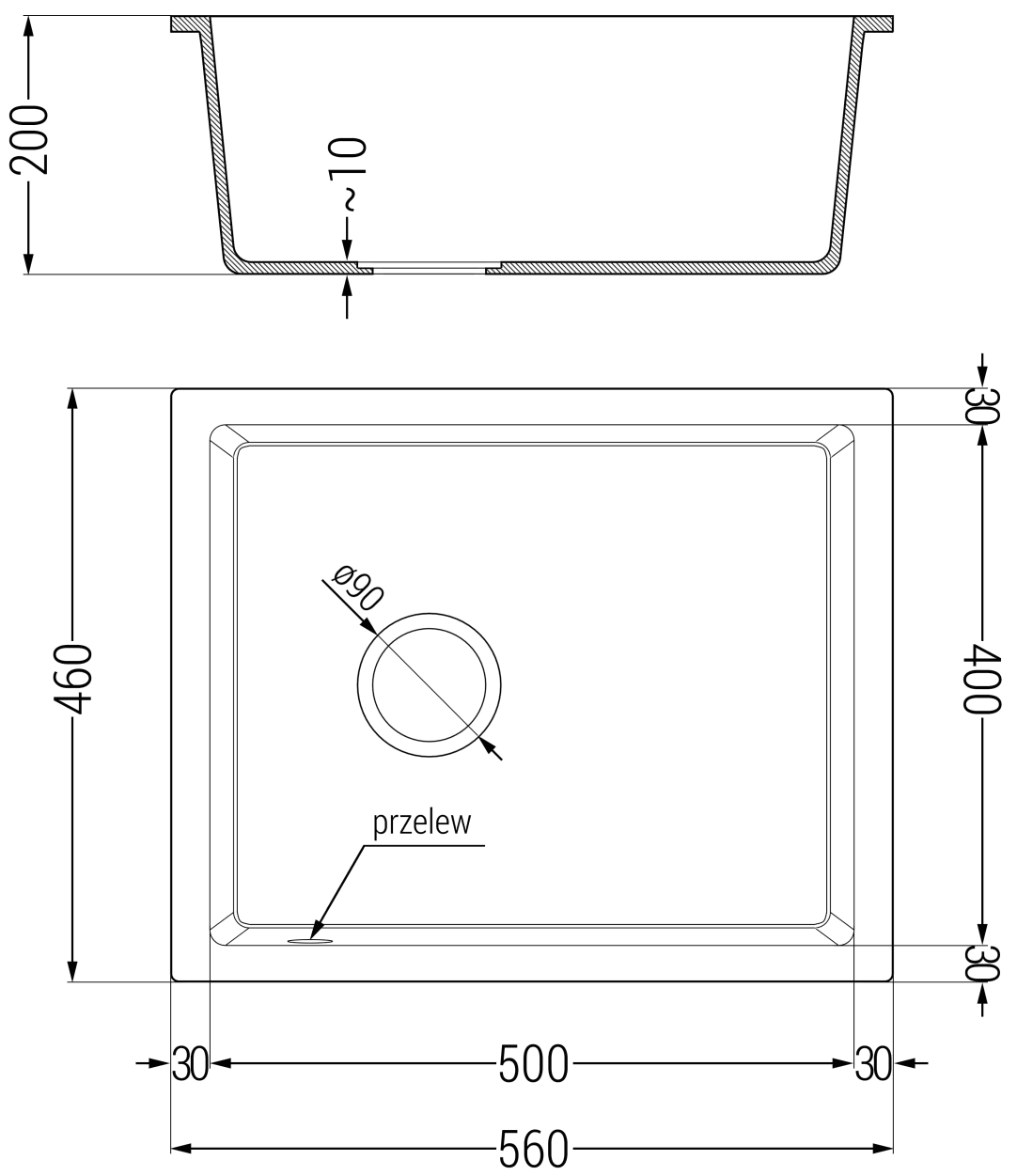Średnica odpływu: ø90 mm