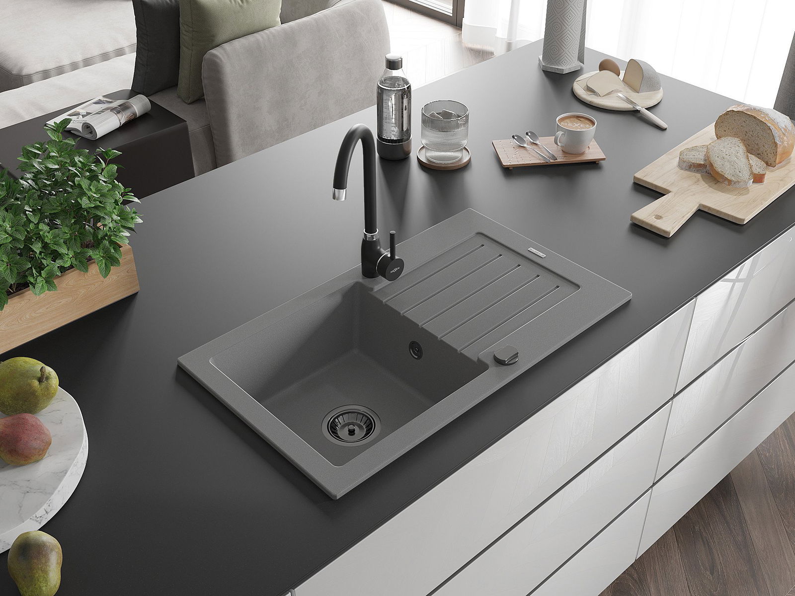 Mexen Pablo zlewozmywak granitowy 1-komorowy z ociekaczem 752 x 436 mm, szary, syfon czarny - 6510751010-71-B