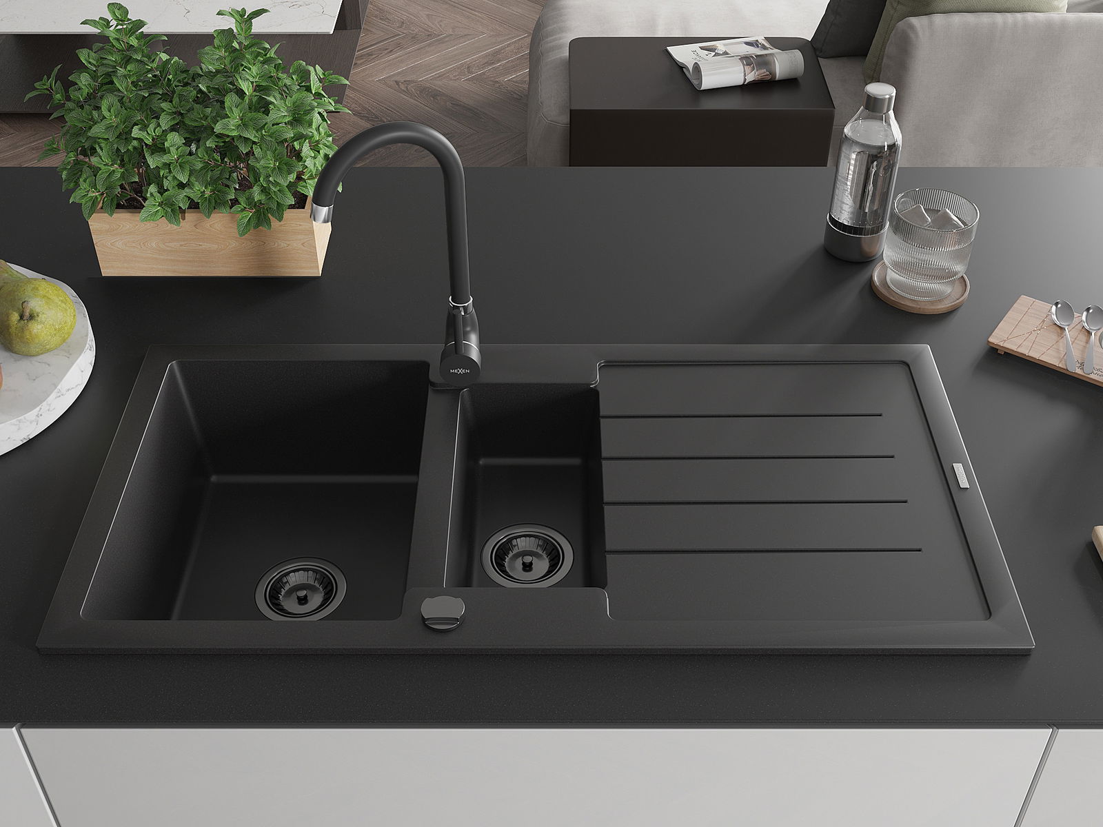 Mexen Andres zlewozmywak granitowy 1,5-komorowy z ociekaczem 1000 x 500 mm czarny, syfon czarny - 6515101510-77-B