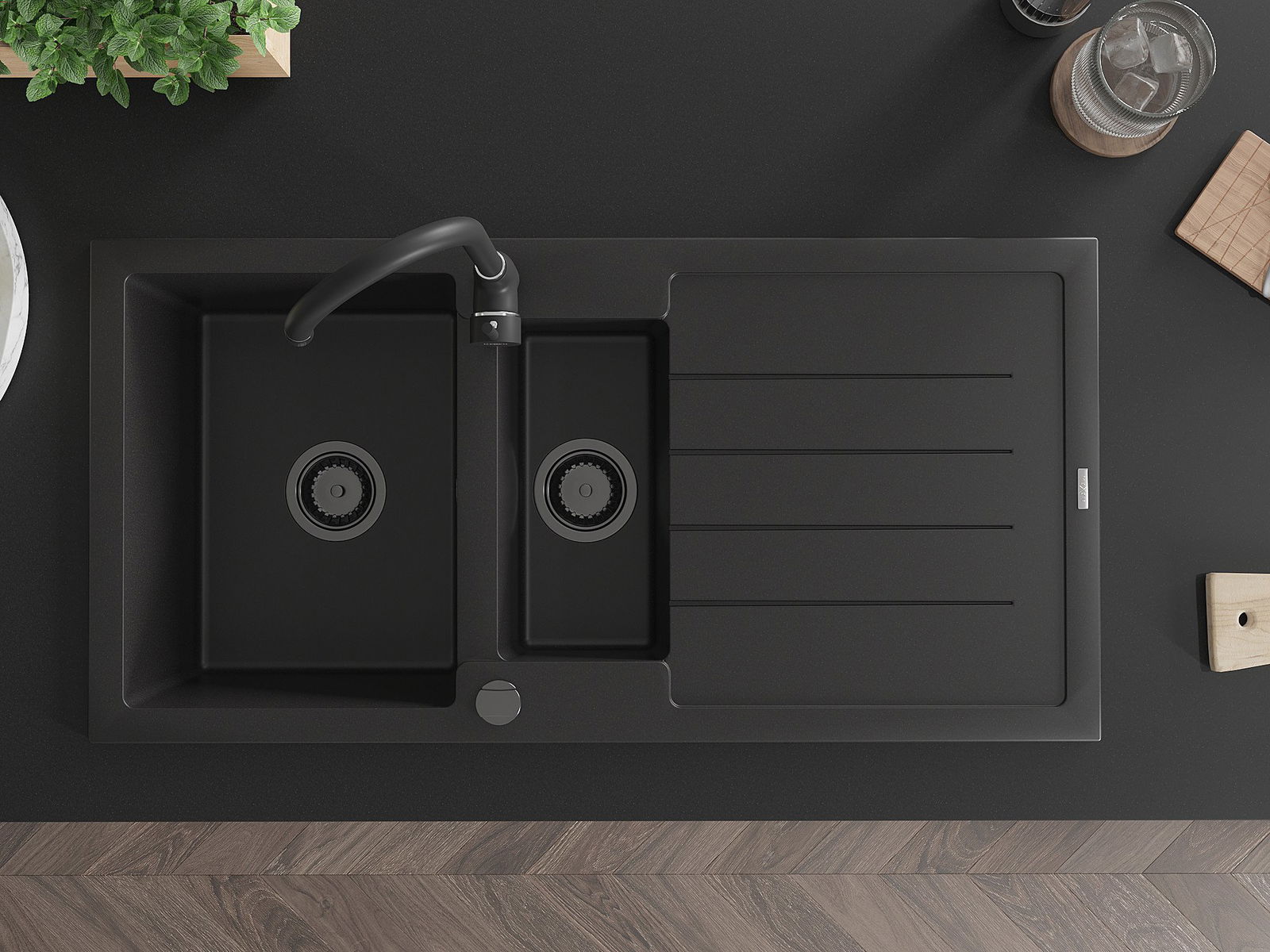 Dzięki zastosowaniu uniwersalnego systemu mocowania, zlew jest odwracalny, a ociekacz może zostać zamontowany na blacie po lewej lub prawej stronie. W ten sposób możesz z łatwością dopasować stronę do swoich potrzeb i warunków.