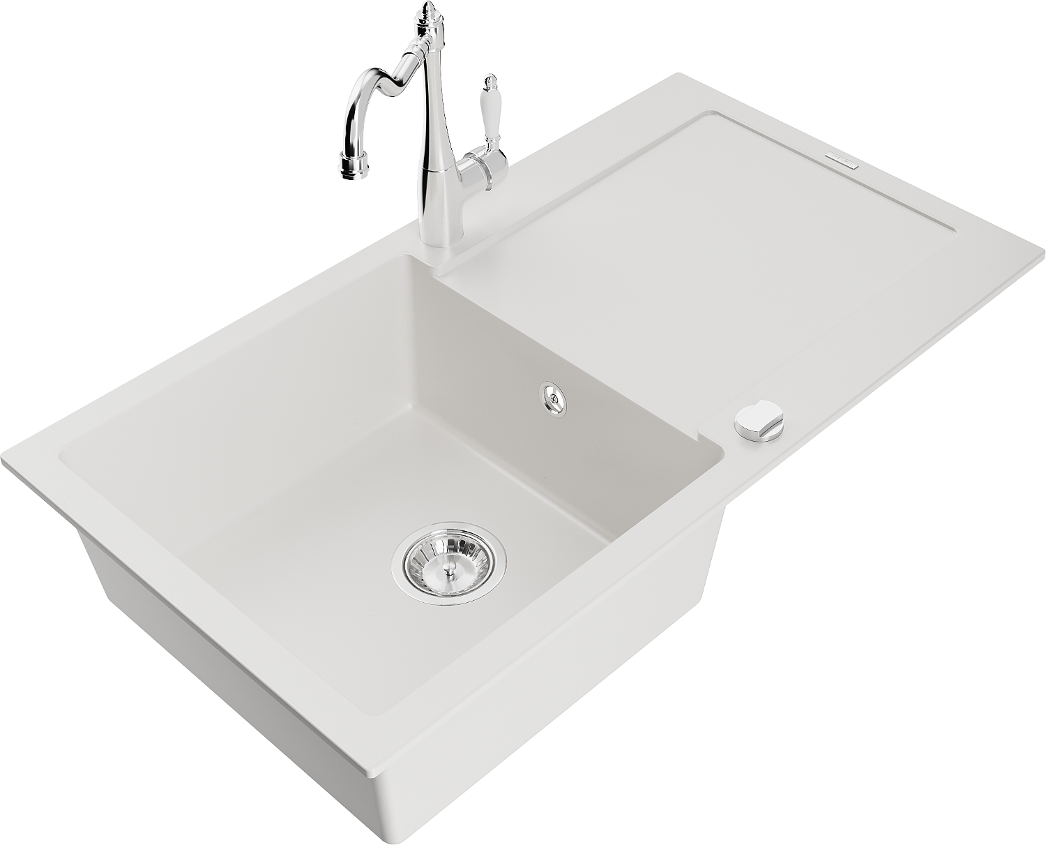 Mexen Leo zlewozmywak granitowy 1-komorowy z ociekaczem i baterią kuchenną Carla, biały - 6501-20-670700-00