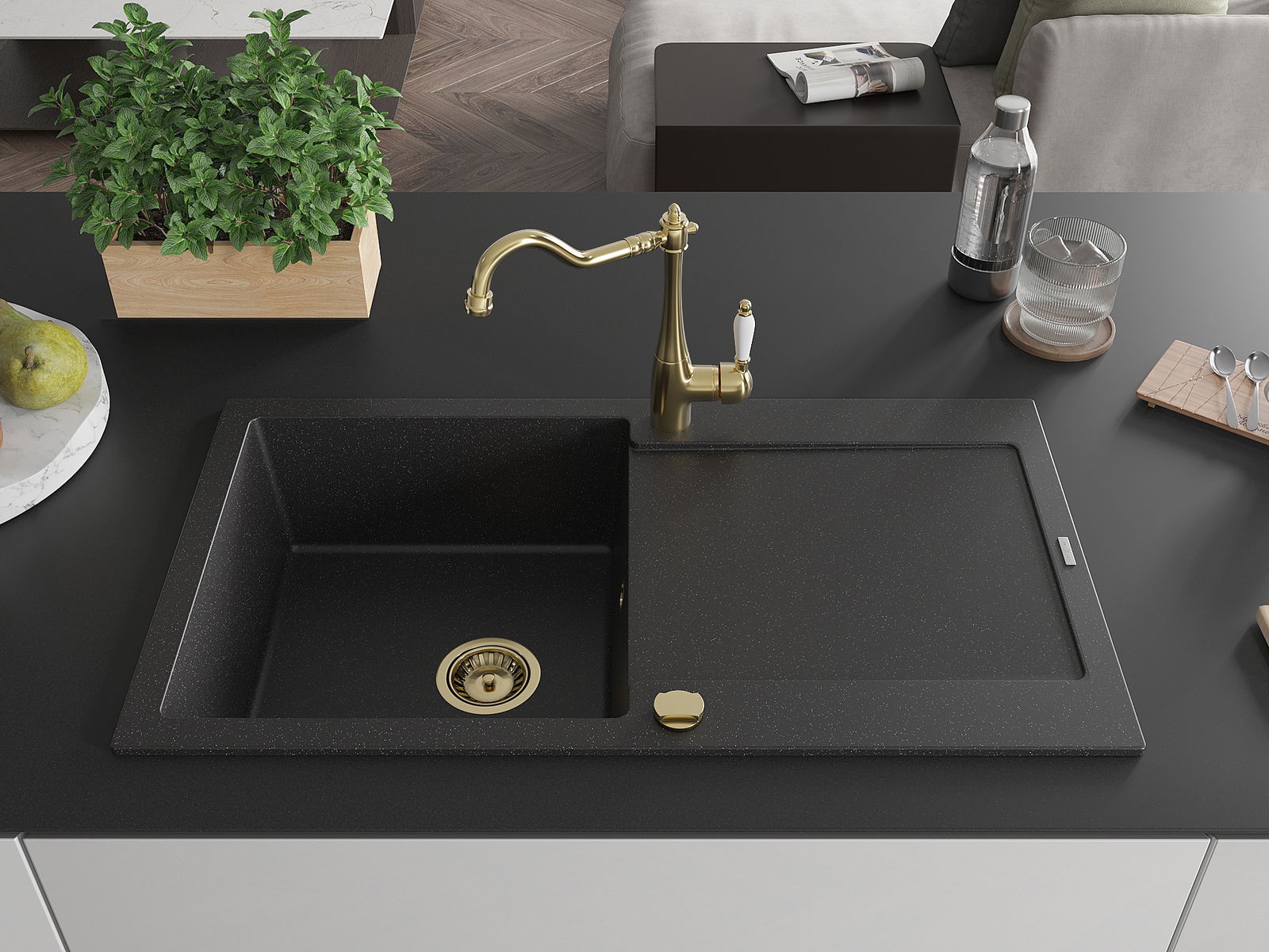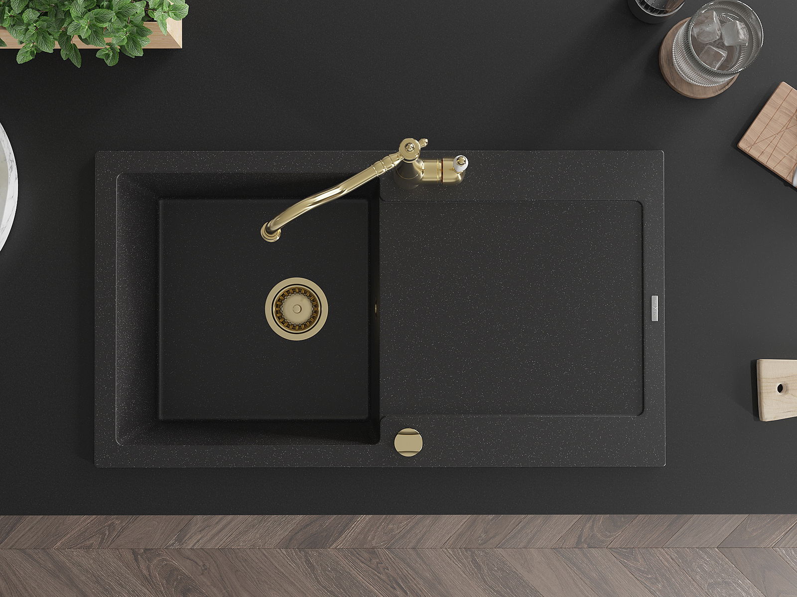 Mexen Leo zlewozmywak granitowy 1-komorowy z ociekaczem i baterią kuchenną Carla, czarny/srebrny metalik - 6501-73-670700-50