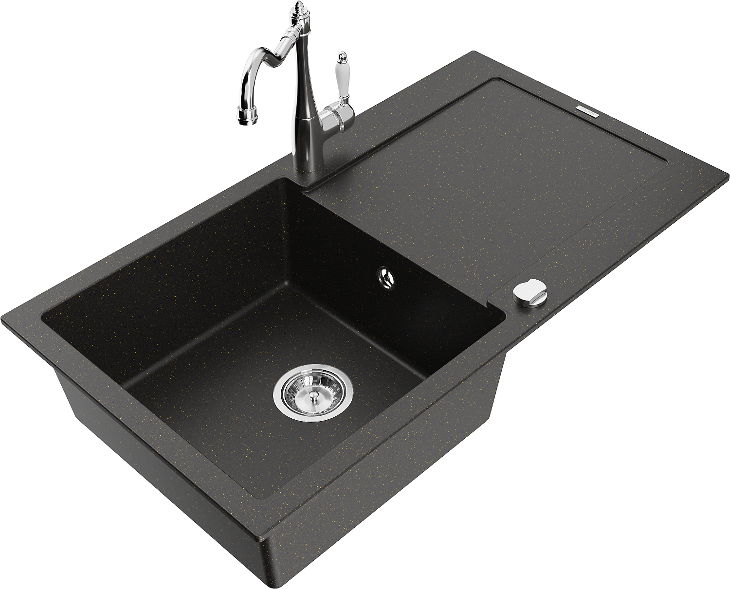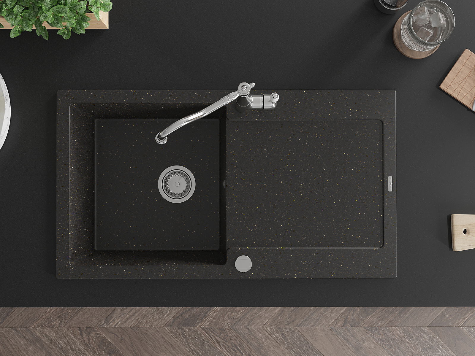 Mexen Leo zlewozmywak granitowy 1-komorowy z ociekaczem i baterią kuchenną Carla, czarny/złoty metalik - 6501-75-670700-00