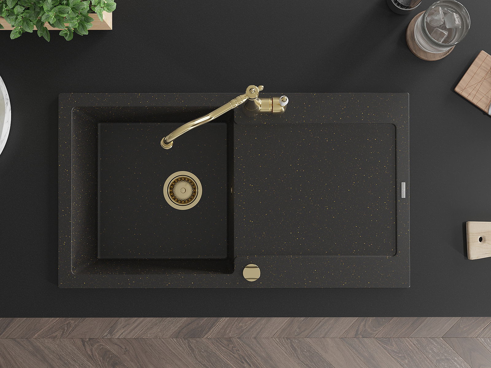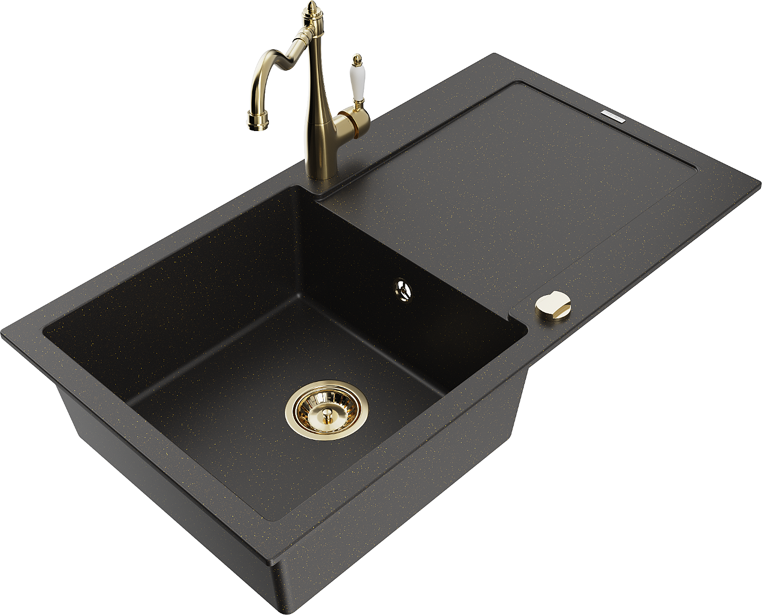 Mexen Leo zlewozmywak granitowy 1-komorowy z ociekaczem i baterią kuchenną Carla, czarny/złoty metalik - 6501-75-670700-50