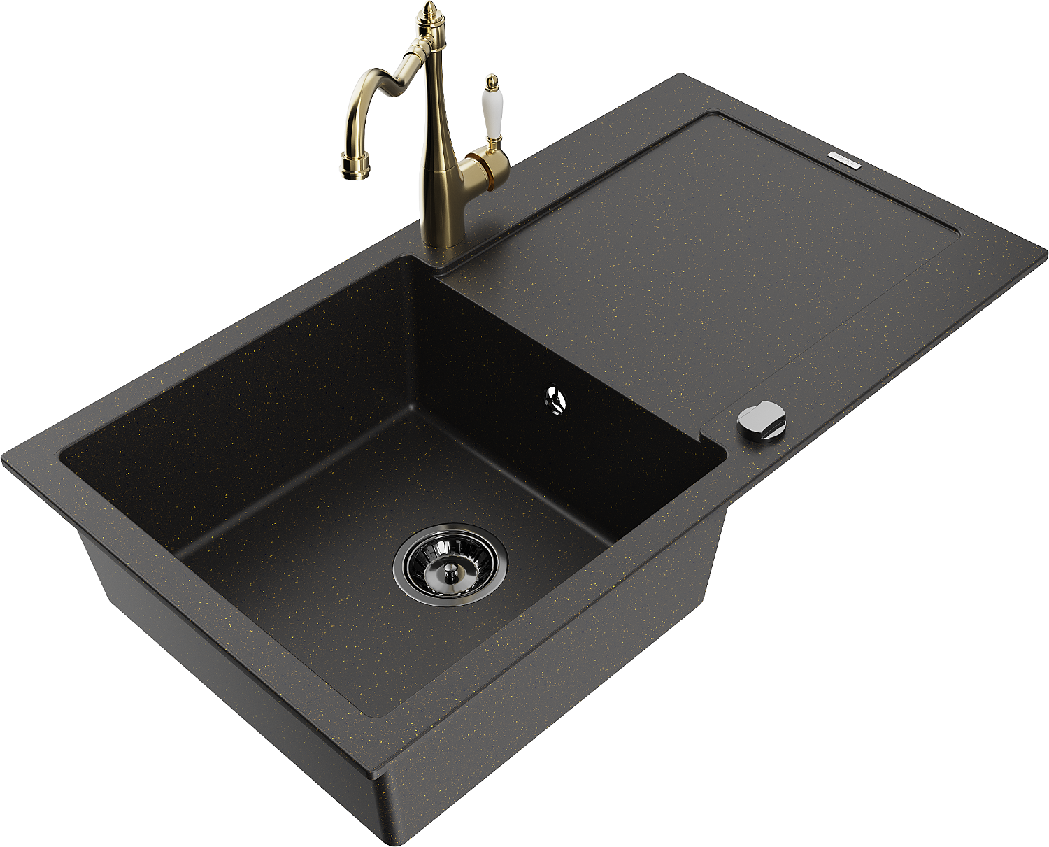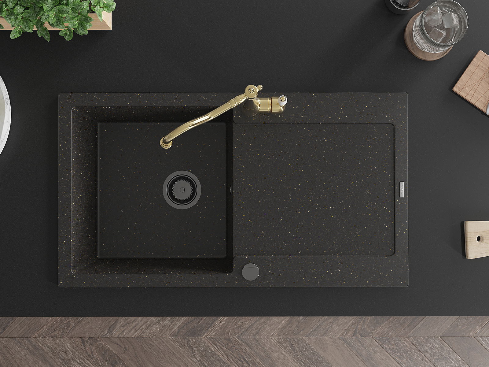 Mexen Leo zlewozmywak granitowy 1-komorowy z ociekaczem i baterią kuchenną Carla, czarny/złoty metalik - 6501-75-670700-50-B