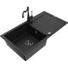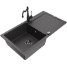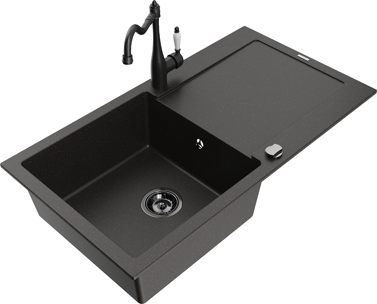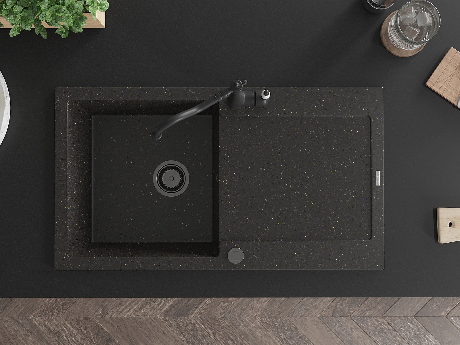 Mexen Leo zlewozmywak granitowy 1-komorowy z ociekaczem i baterią kuchenną Carla, czarny/złoty metalik - 6501-75-670700-70-B