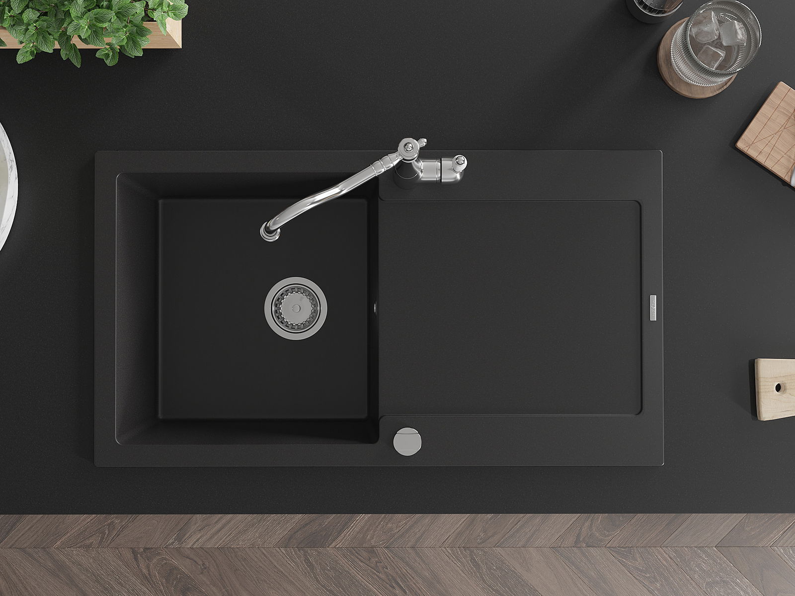 Dzięki zastosowaniu uniwersalnego systemu mocowania, zlew jest odwracalny, a ociekacz może zostać zamontowany na blacie po lewej lub prawej stronie. W ten sposób możesz z łatwością dopasować stronę do swoich potrzeb i warunków.