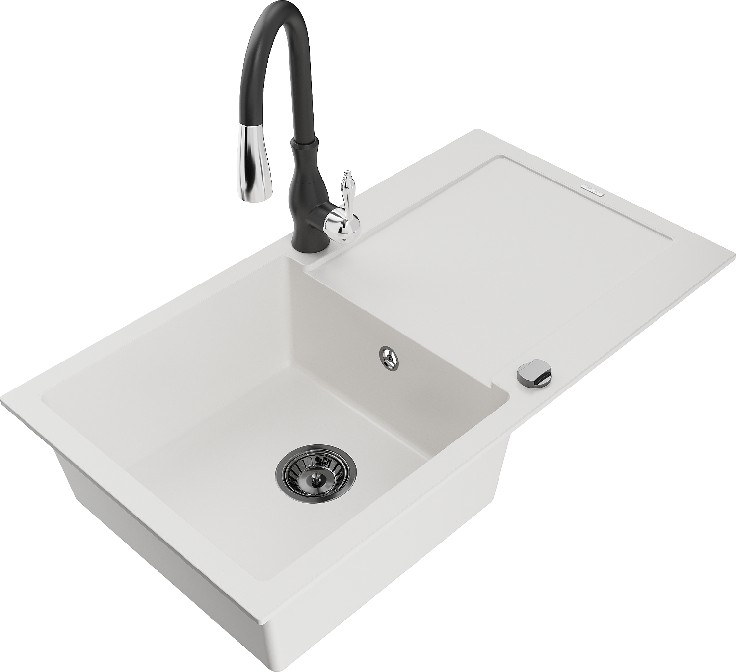 Mexen Leo zlewozmywak granitowy 1-komorowy z ociekaczem i baterią kuchenną Savita, biały - 6501-20-672601-70