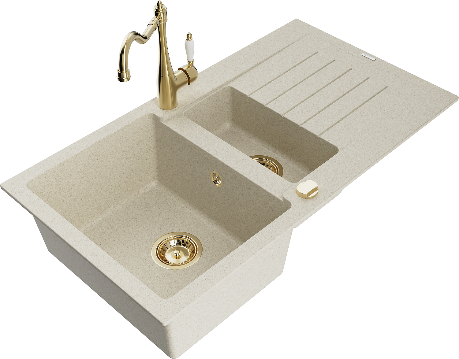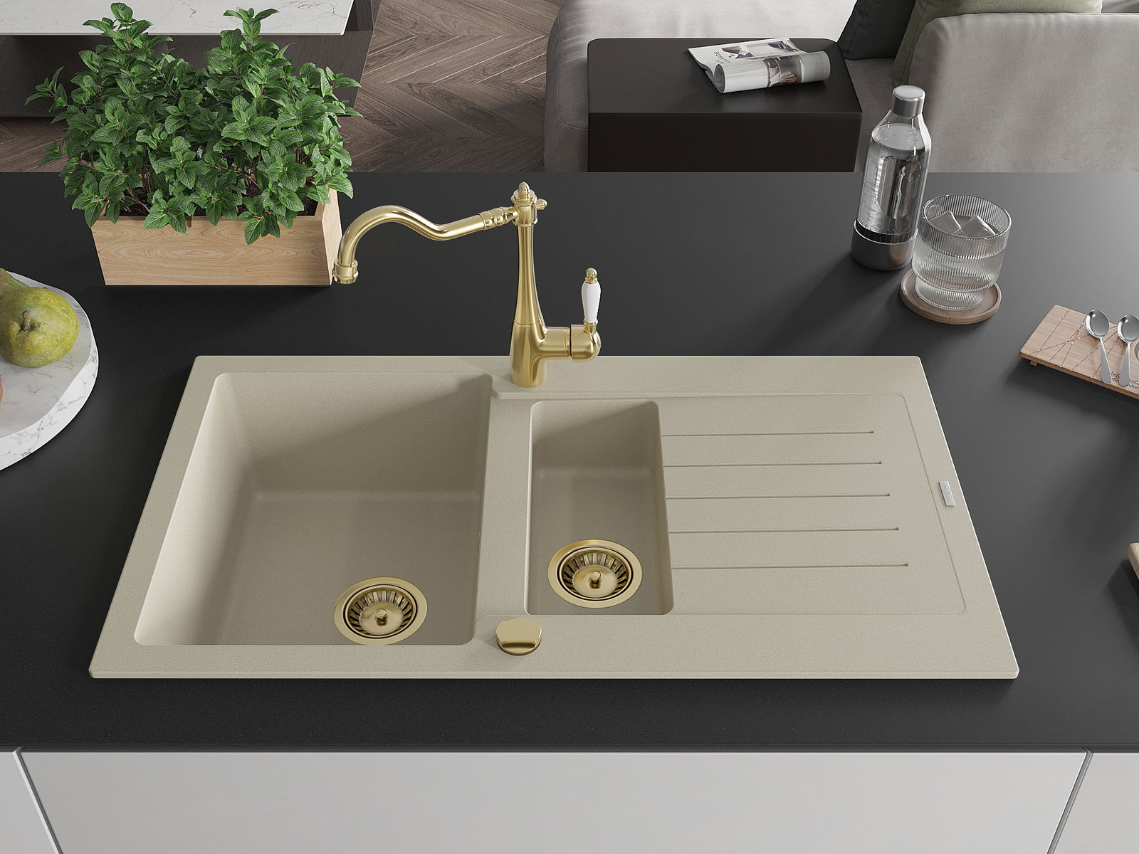 Mexen Matias zlewozmywak granitowy 1,5-komorowy z ociekaczem i baterią kuchenną Carla, beżowy - 6502-69-670700-50